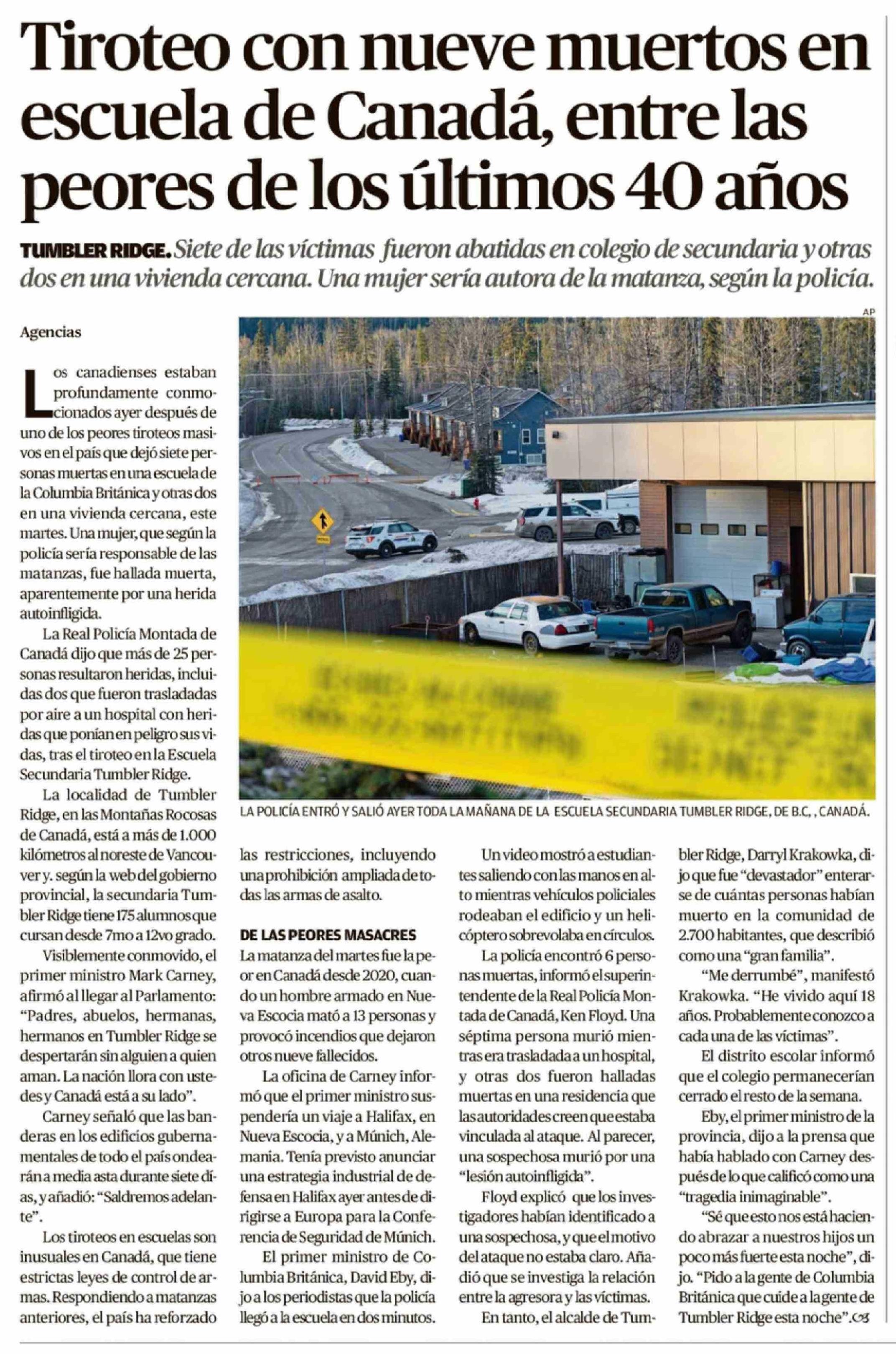Tiroteo con nueve muertos en escuela de Canadá, entre las peores de los últimos 40 años 12-02-2026 El Austral de Osorno |