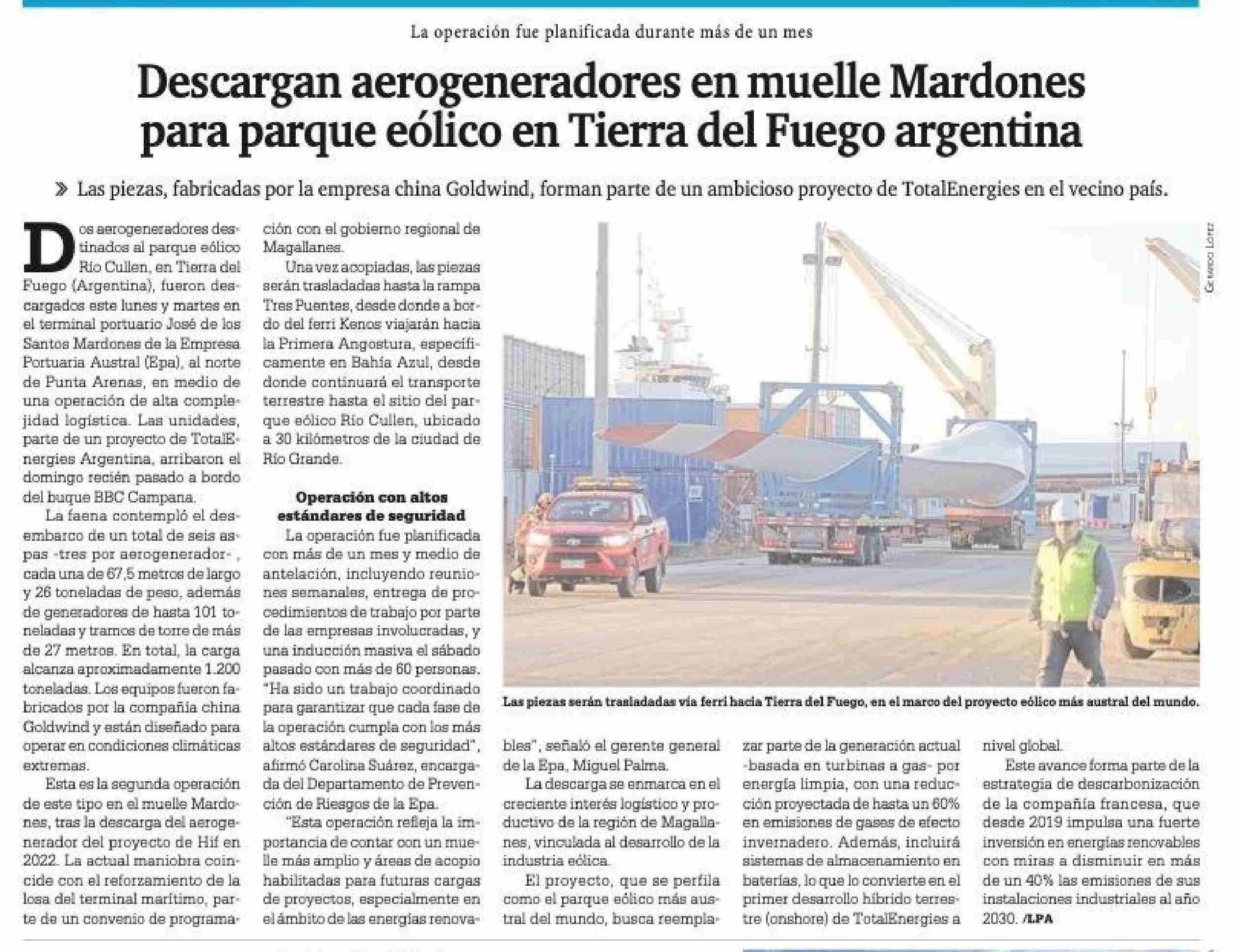 Descargan aerogeneradores en muelle Mardones para parque eólico en Tierra del Fuego argentina 18-06-2025 La Prensa Austral |