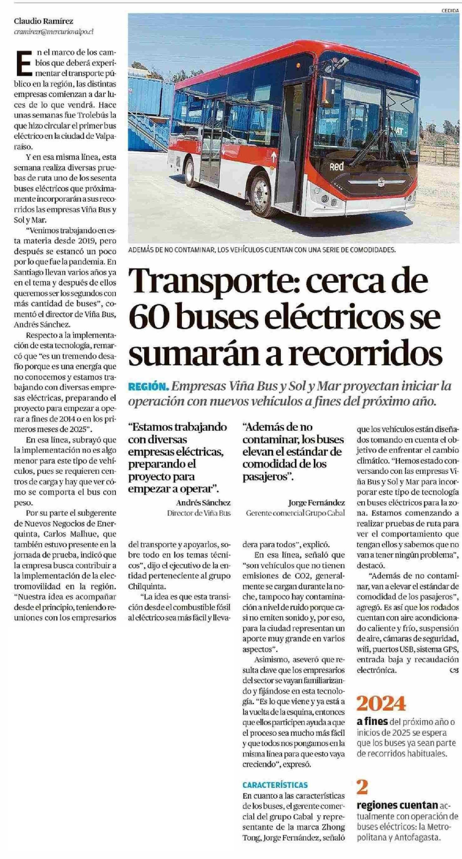 Transporte: cerca de 60 buses eléctricos se sumarán a recorridos 06-12-2023 El Mercurio de Valparaíso |