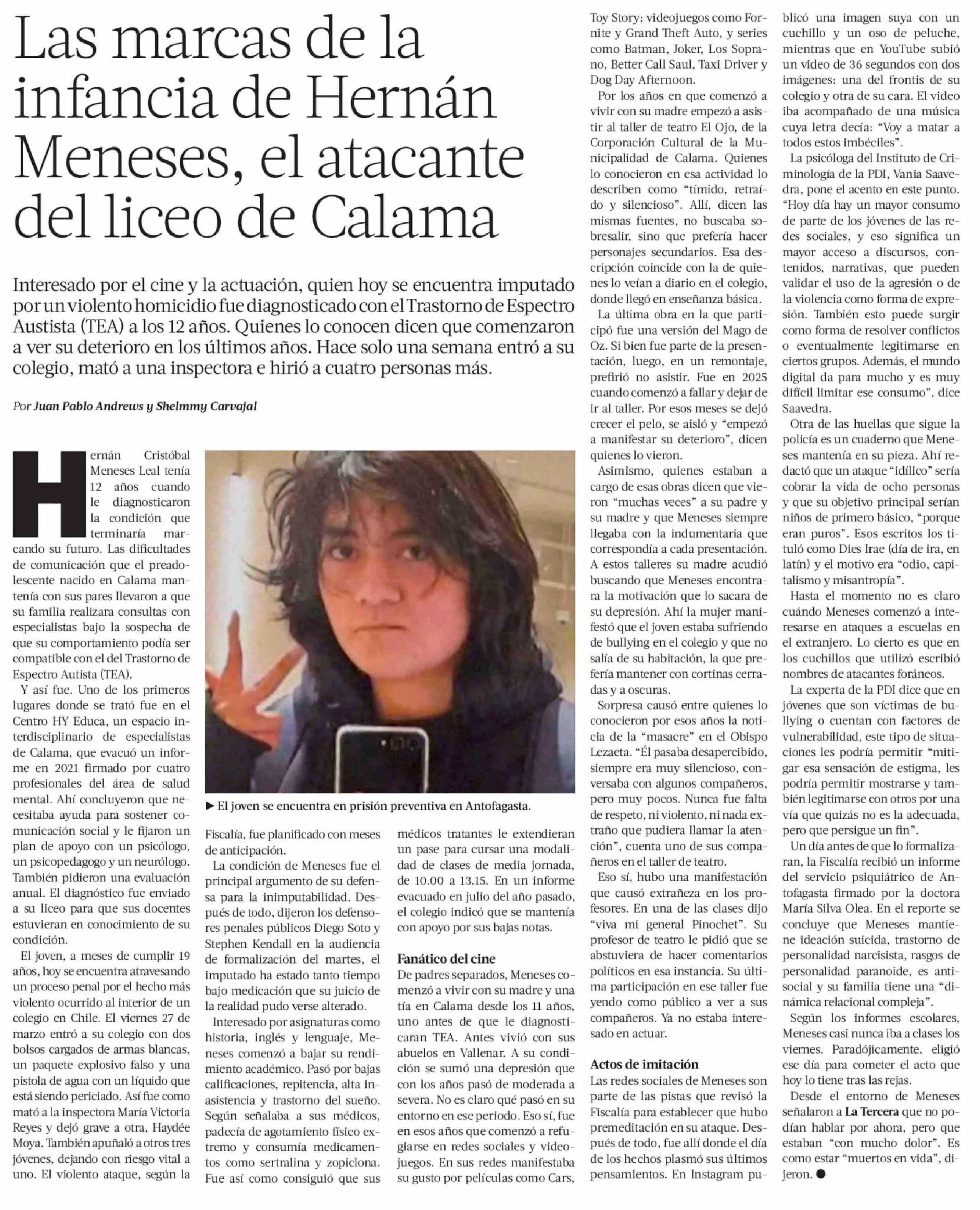 Las marcas de la infancia de Hernán Meneses, el atacante del liceo de Calama 04-04-2026 La Tercera |