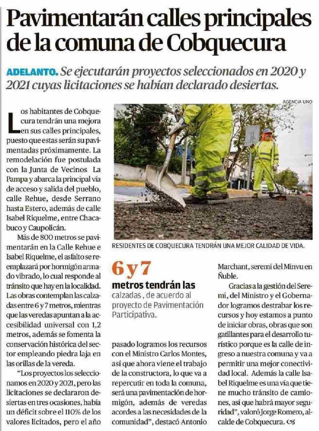 | Título: | Pavimentarán calles principales de la comuna de Cobquecura |