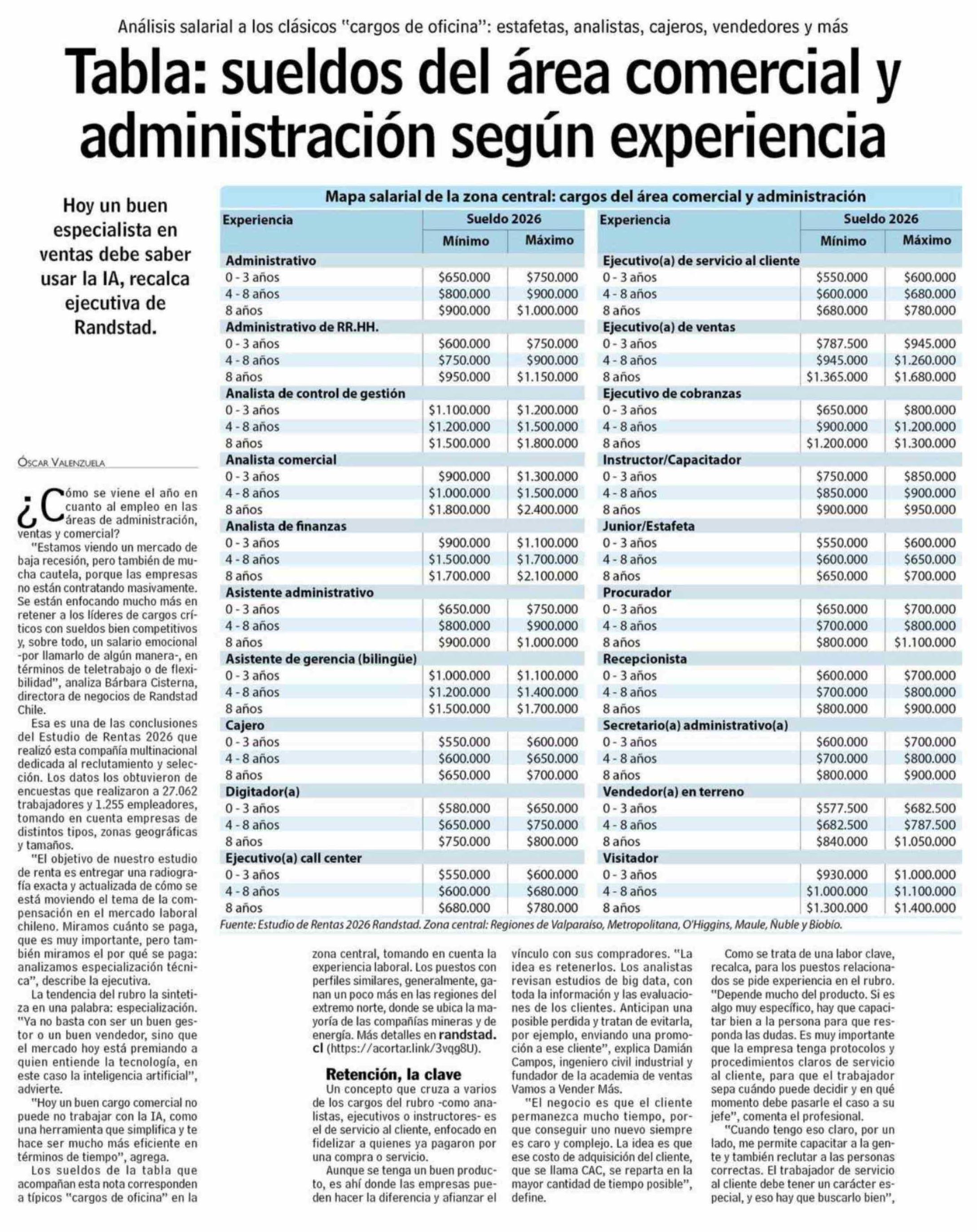 Tabla: sueldos del área comercial y administración según experiencia 04-04-2026 Las Últimas Noticias |