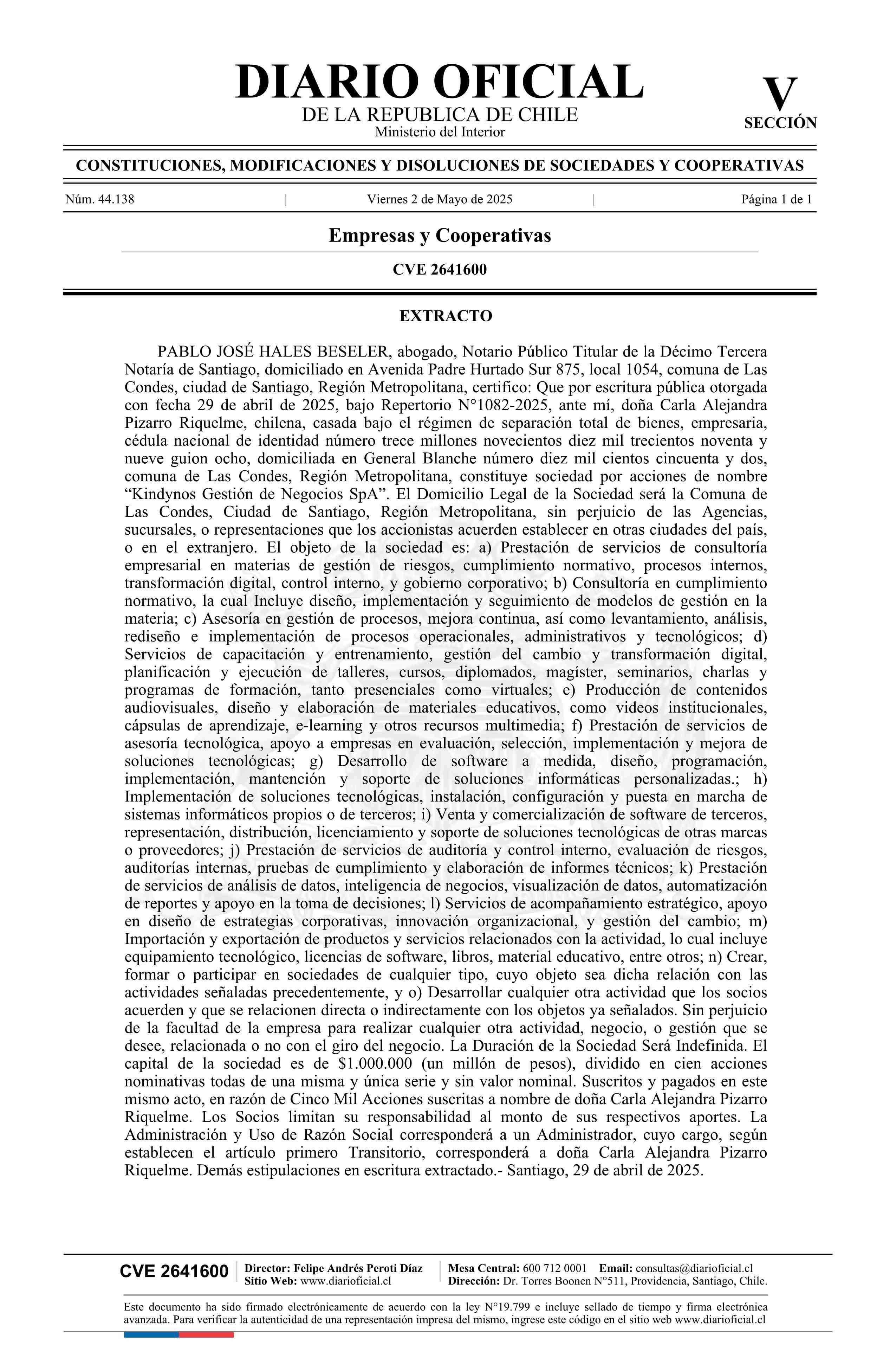 Kindynos Gestión de Negocios SpA 02-05-2025 Diario Oficial Edición Electrónica |