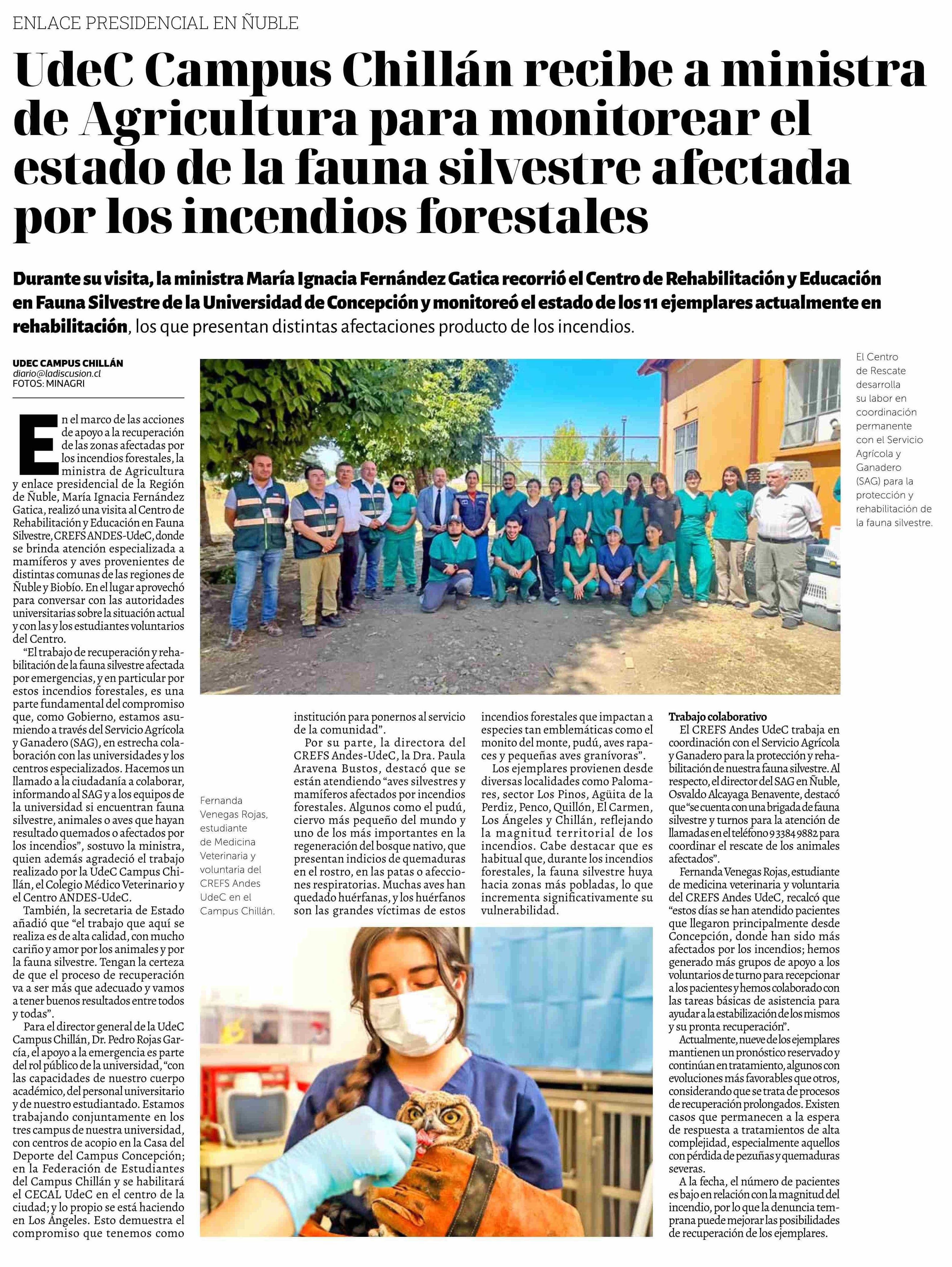 Título: UdeC Campus Chillán recibe a ministra de Agricultura para monitorear el estado de la fauna silvestre afectada por los incendios forestales