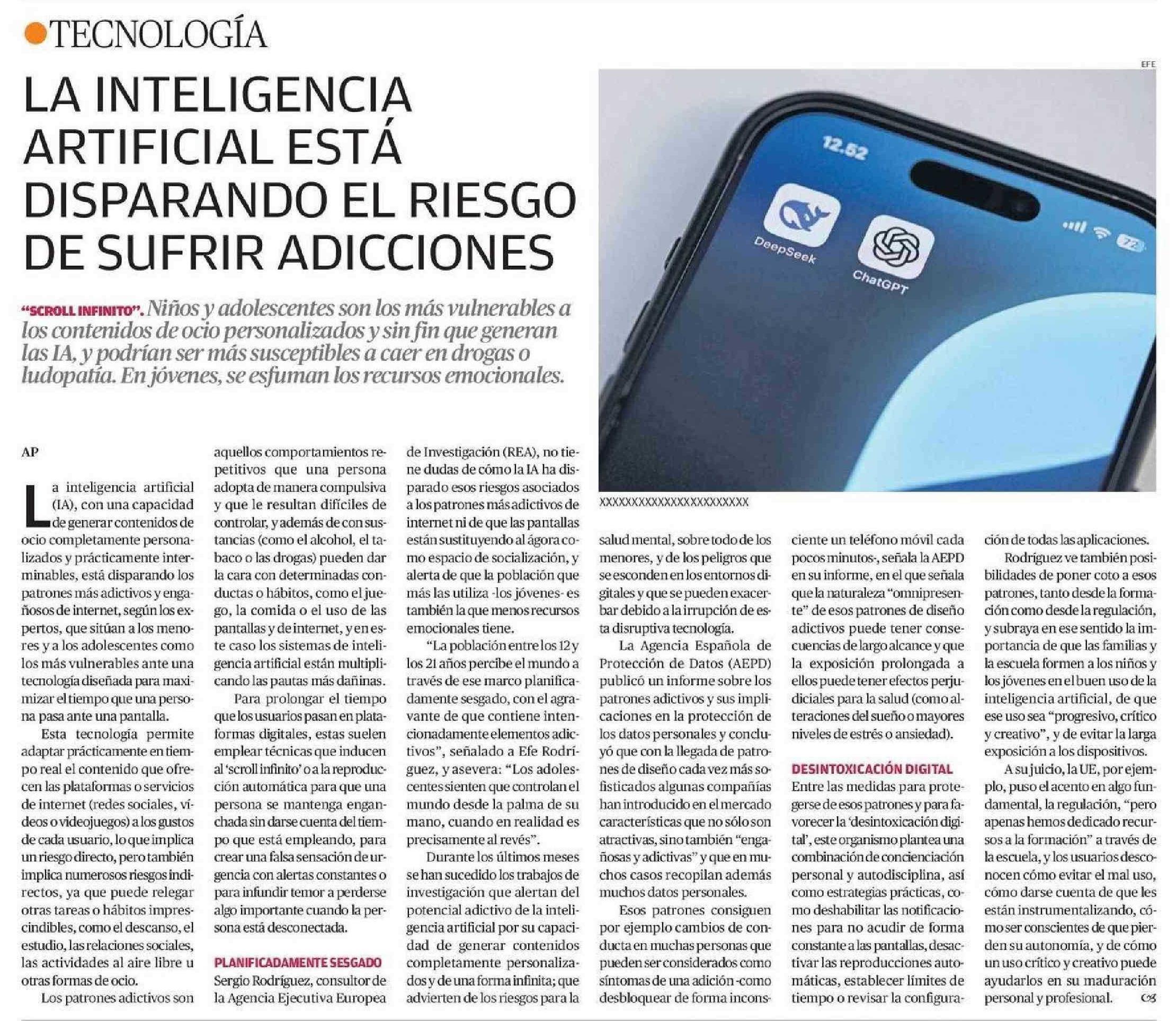 LA INTELIGENCIA ARTIFICIAL ESTA DISPARANDO EL RIESGO DE SUFRIR ADICCIONES 28-05-2025 El Diario de Atacama |