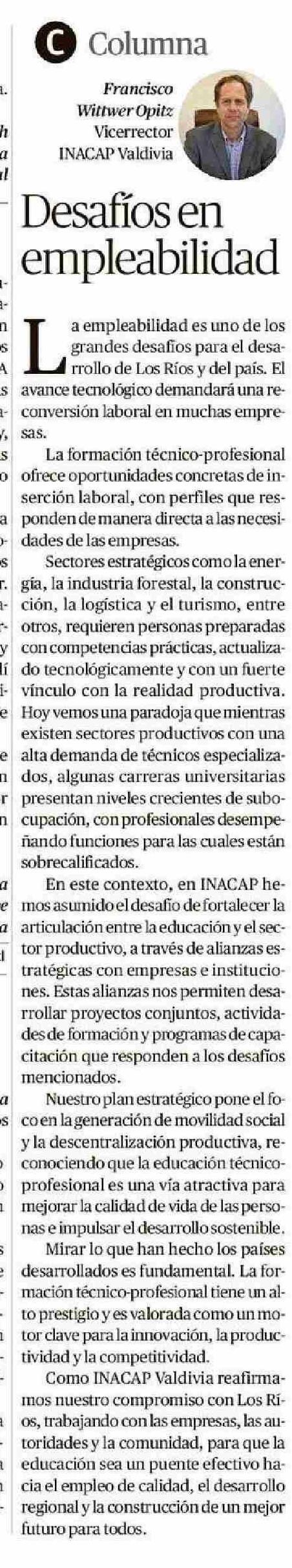 Columnas de Opinión: Desafíos en empleabilidad 15-05-2025 Diario Austral Región de Los Ríos |