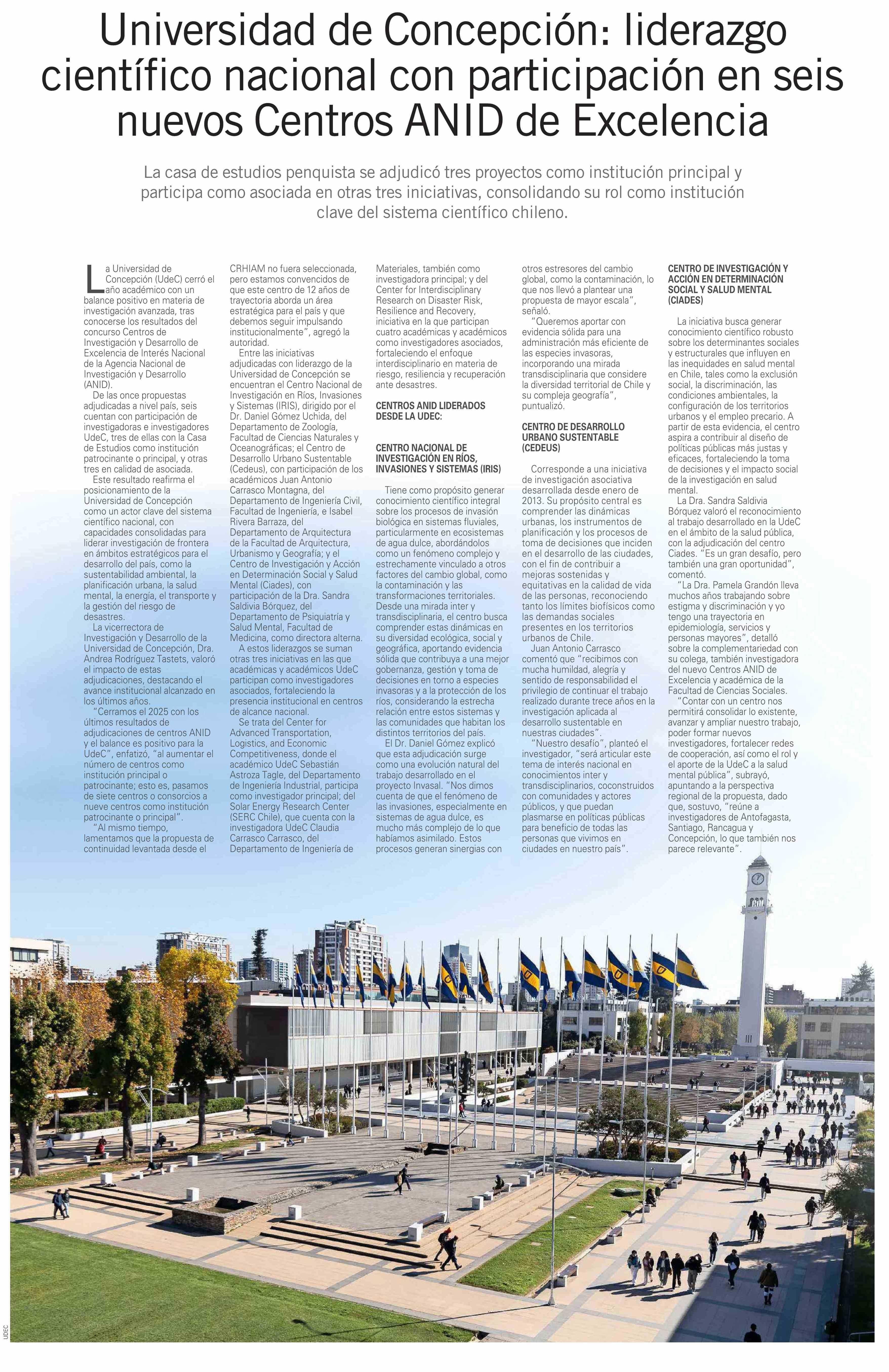 Universidad de Concepción: liderazgo científico nacional con participación en seis nuevos Centros ANID de Excelencia 16-01-2026 El Mercurio |