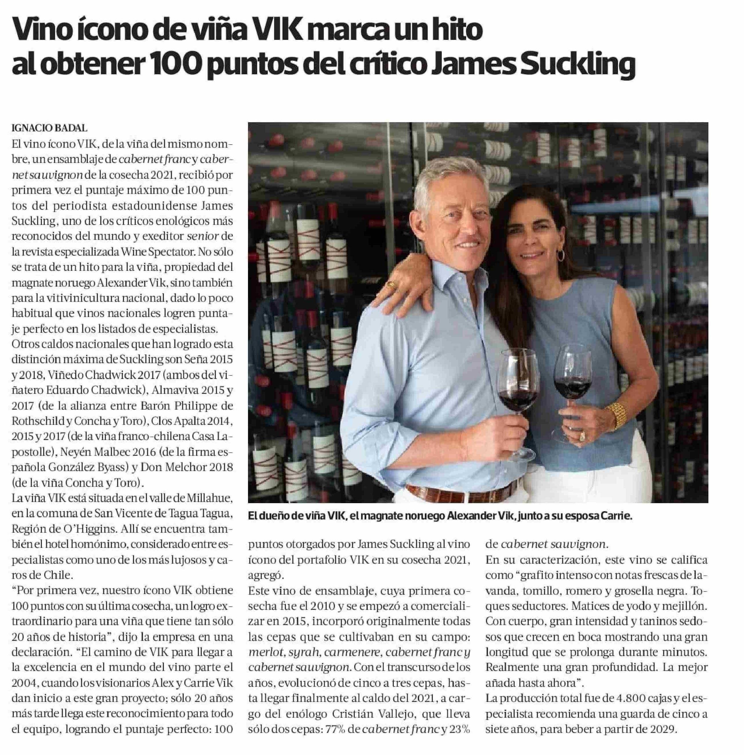 Vino ícono de viña VIK marca un hito al obtener 100 puntos del crítico James Suckling 01-03-2024 La Tercera |