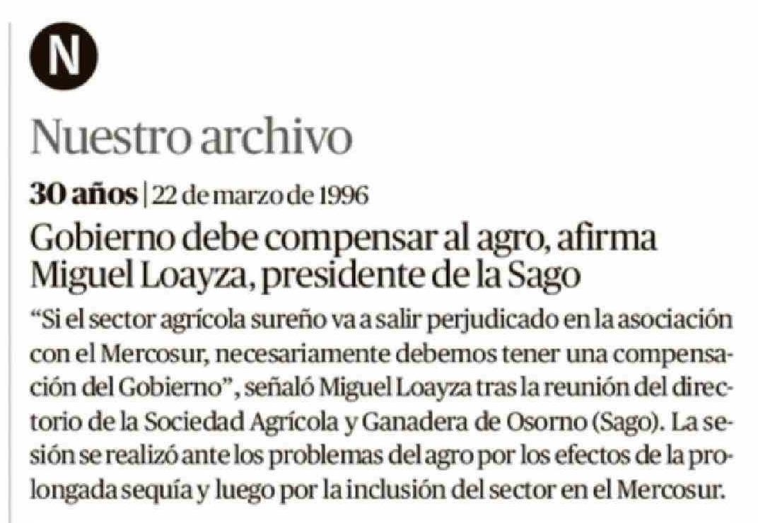 Título: 30 años | 22 de marzo de 1996 Gobierno debe compensar al agro, afirma Miguel Loayza, presidente de la Sago "Si el sector agrícola sureño va a salir perjudicado en la asociación con el Mercosur, necesariamente debemos tener una compensación del Gobierno", señaló Miguel Loayza tras la reunión del dire