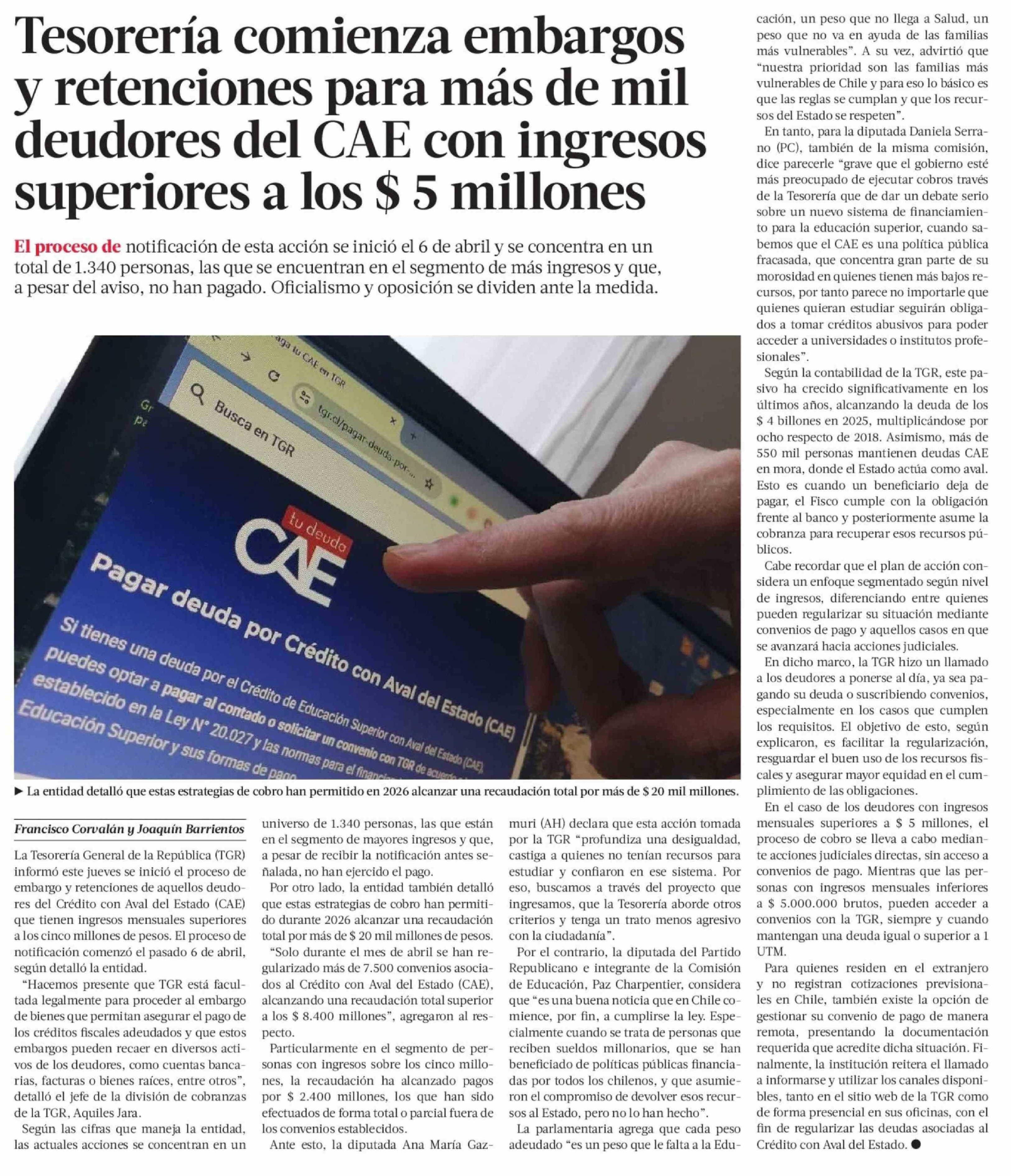 Título: Tesorería comienza embargos y retenciones para más de mil deudores del CAE con ingresos superiores a los $ 5 millones