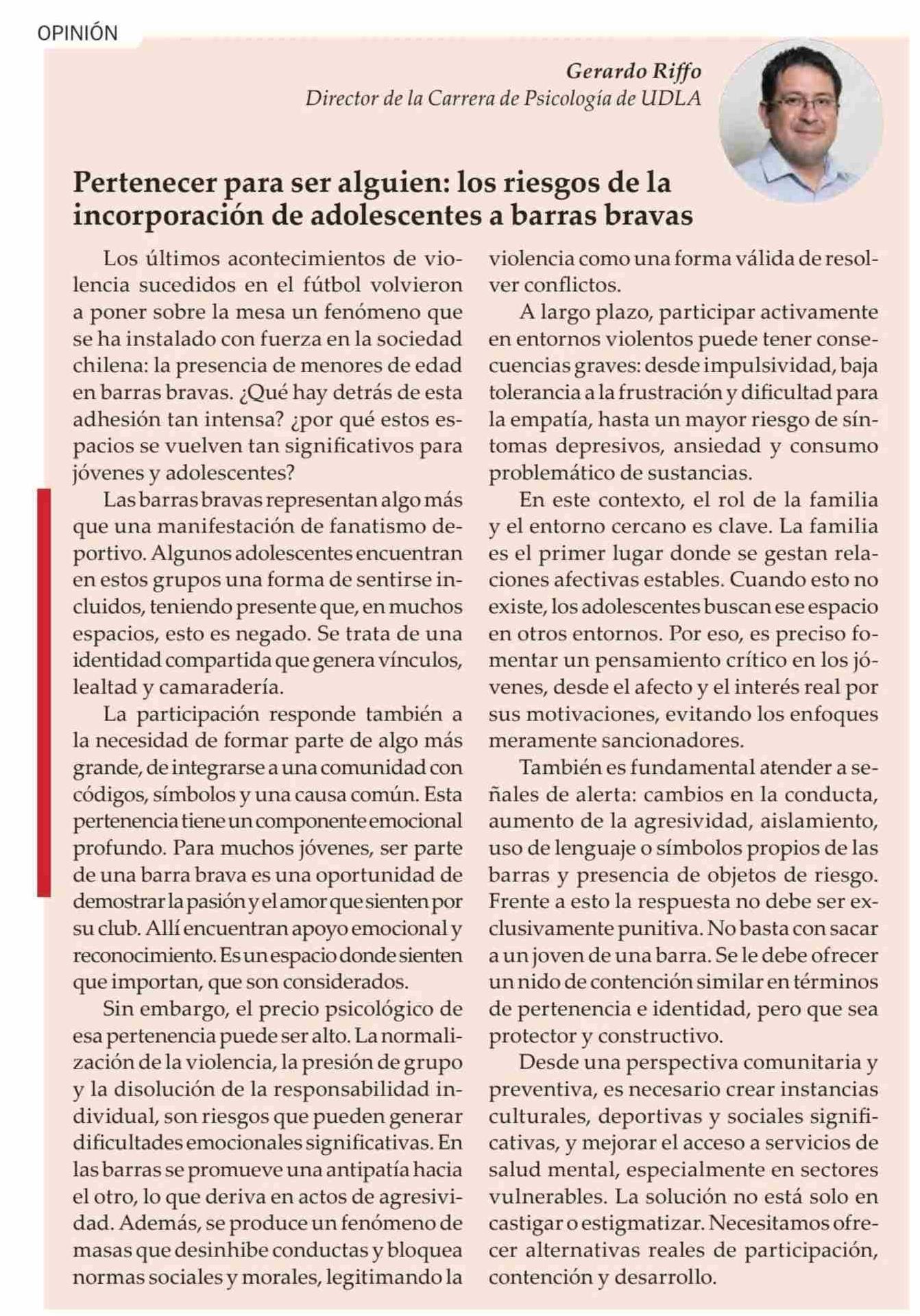 | Título: | COLUMNAS DE OPINIÓN: Pertenecer para ser alguien: los riesgos de la incorporación de adolescentes a barras bravas |