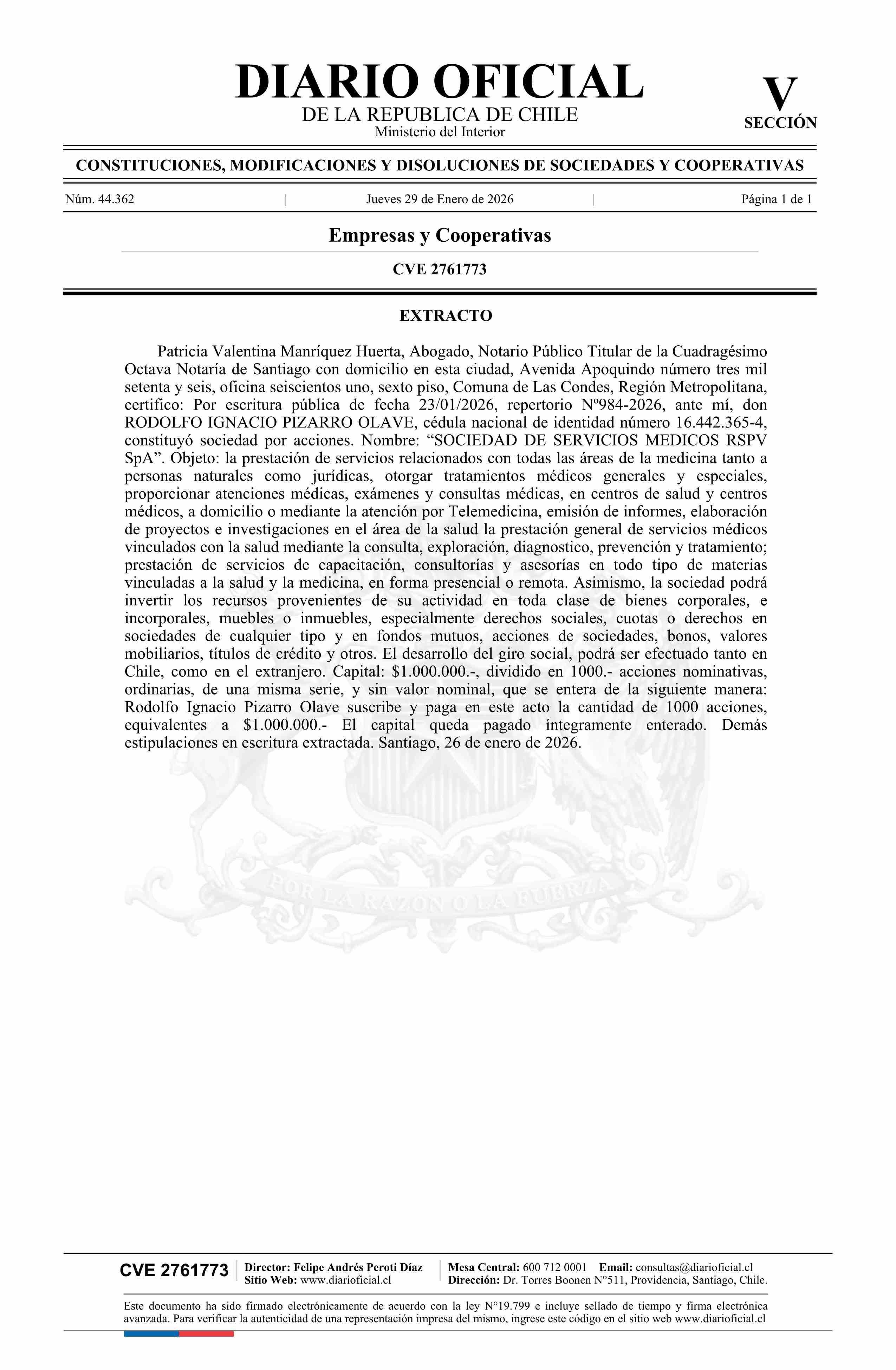 SOCIEDAD DE SERVICIOS MEDICOS RSPV SpA 29-01-2026 Diario Oficial Edición Electrónica |