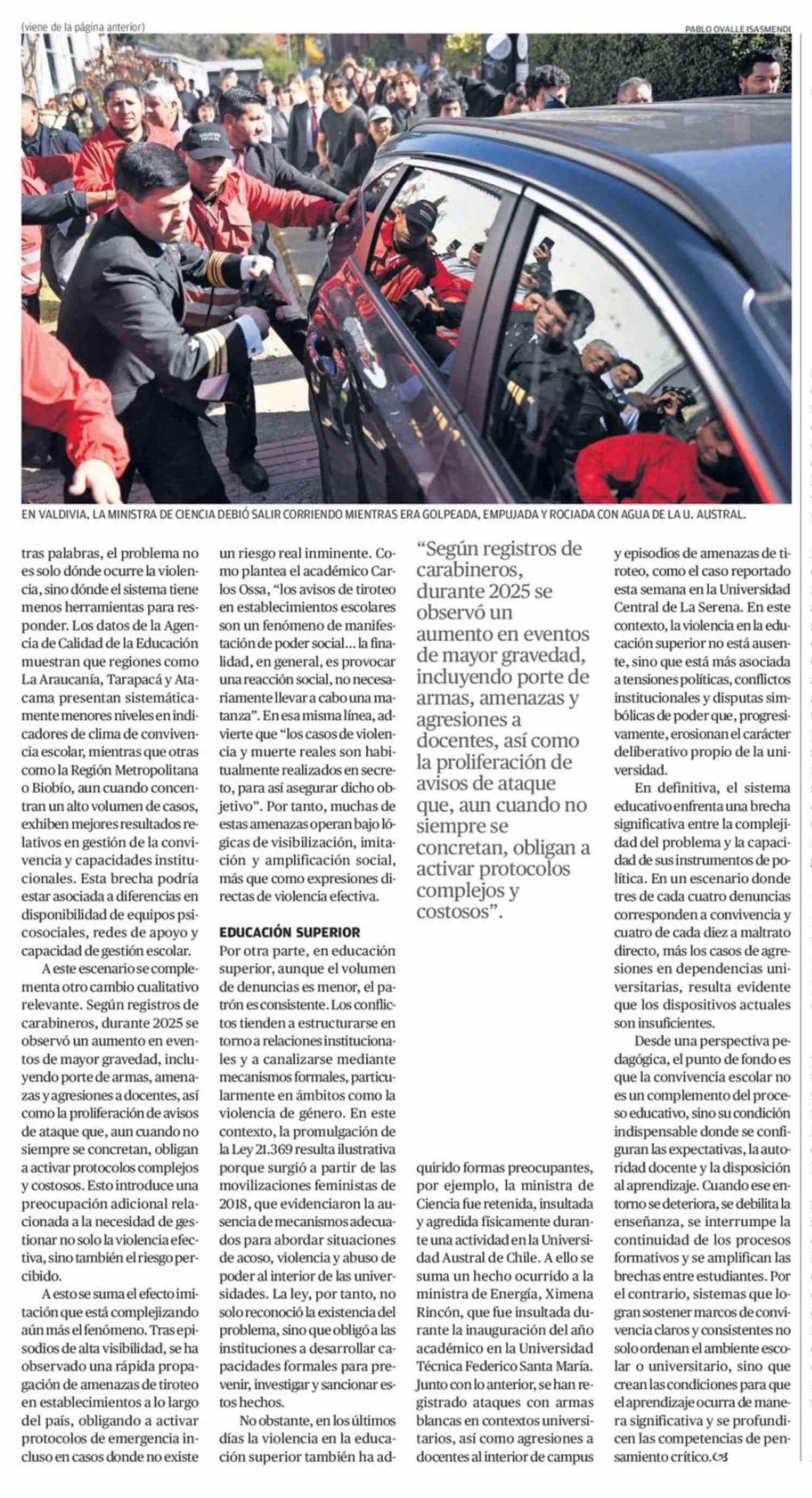 Sin convivencia no hay aprendizajes: radiografía a la violencia escolar en regiones 19-04-2026 El Mercurio de Antofagasta |