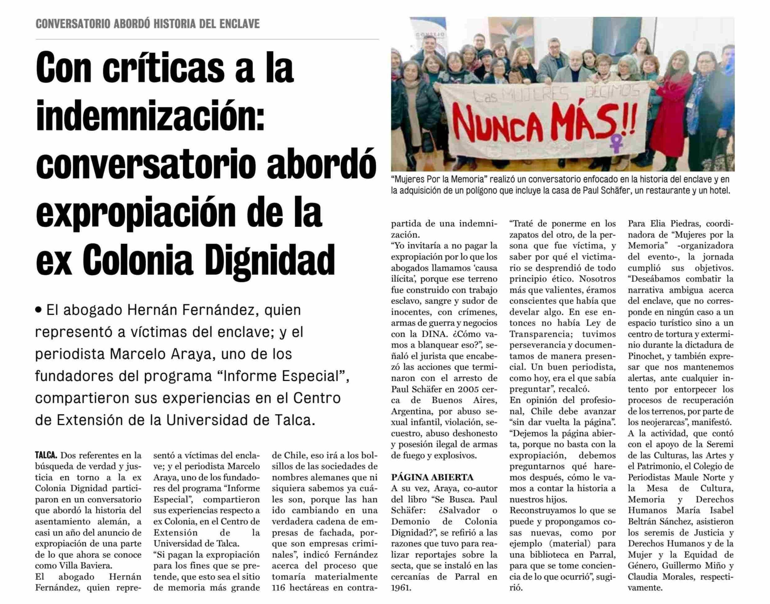 Con críticas a la indemnización: conversatorio abordó expropiación de la ex Colonia Dignidad 29-05-2025 La Prensa de Curicó |