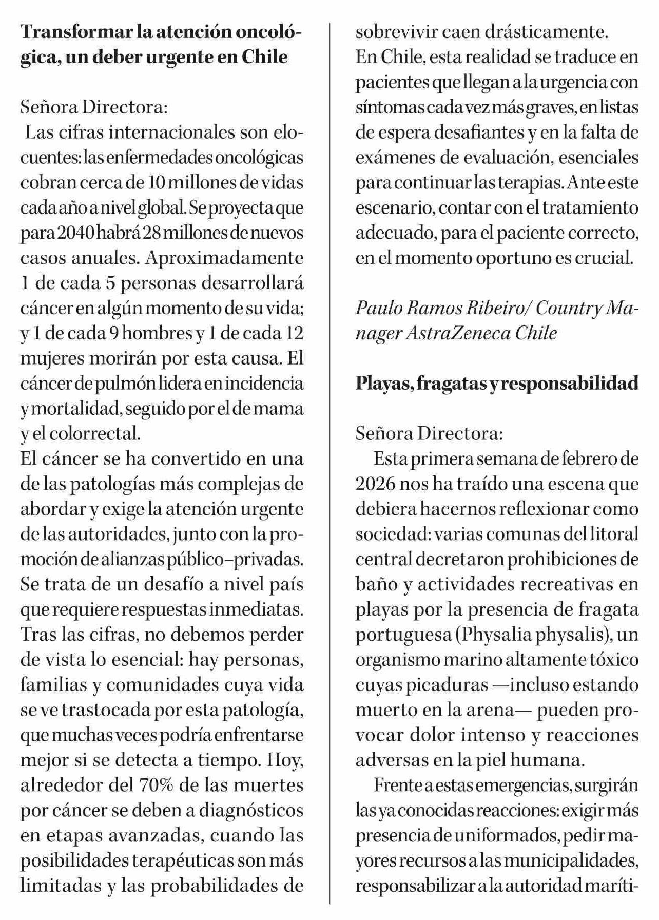 Cartas: Transformar la atención oncológica, un deber urgente en Chile 07-02-2026 Diario Concepción |