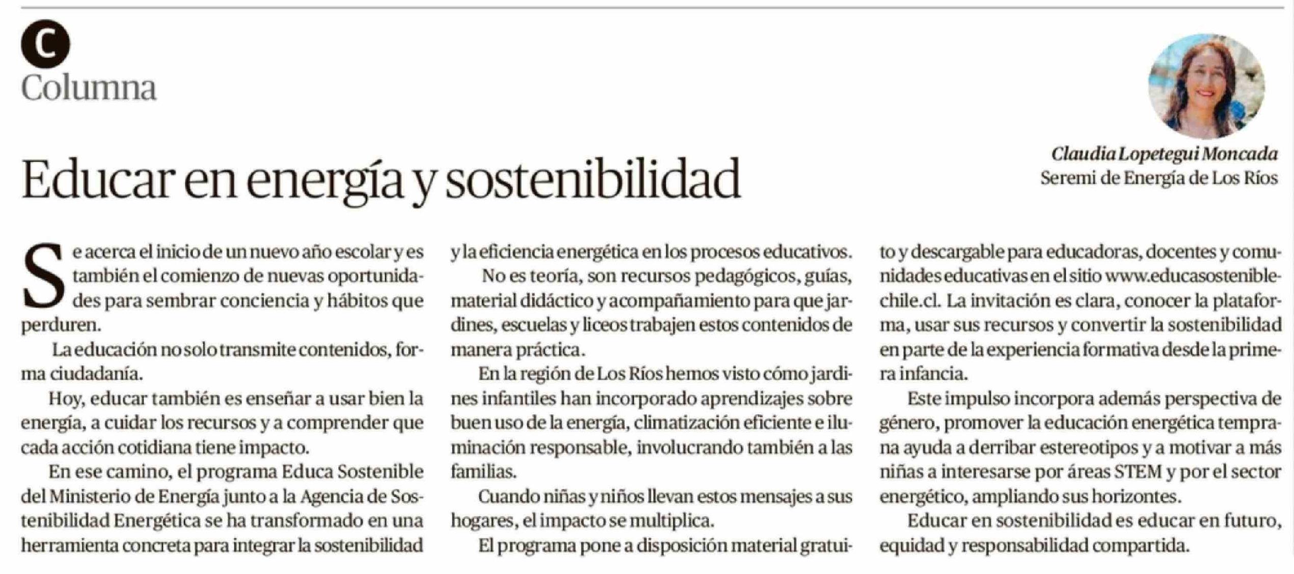 COLUMNAS DE OPINIÓN: Educar en energía y sostenibilidad 18-02-2026 Diario Austral Región de Los Ríos |