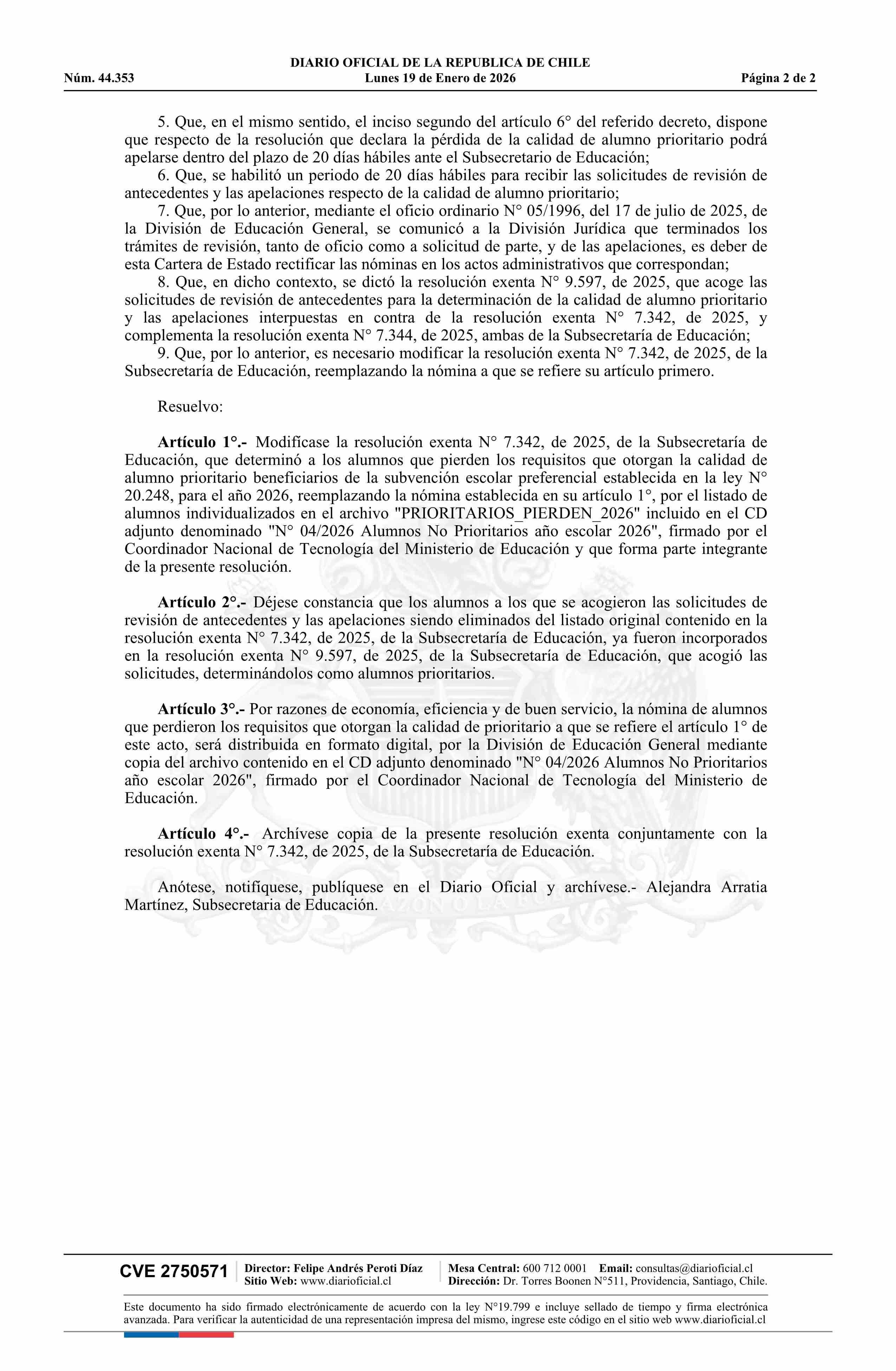 Resolución exenta número 14.264, de 2025.- Modifica resolución N° 7.342 exenta, de 2025, que determina la nómina de alumnos que pierden los requisitos que otorgan la calidad de alumno prioritario de la subvención escolar preferencial establecida por la ley N° 20.248, para el año 2026