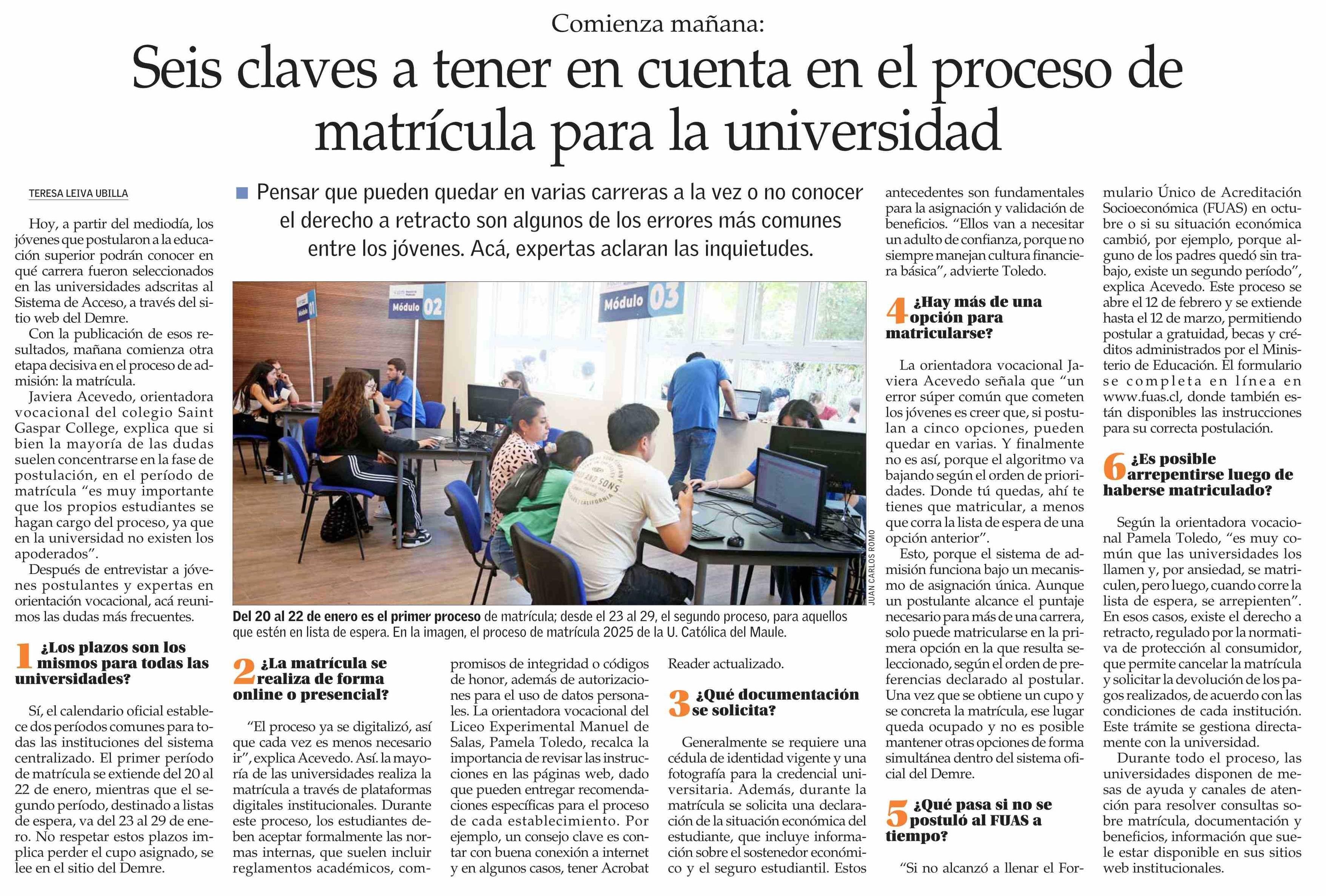 Seis claves a tener en cuenta en el proceso de matrícula para la universidad 19-01-2026 El Mercurio |