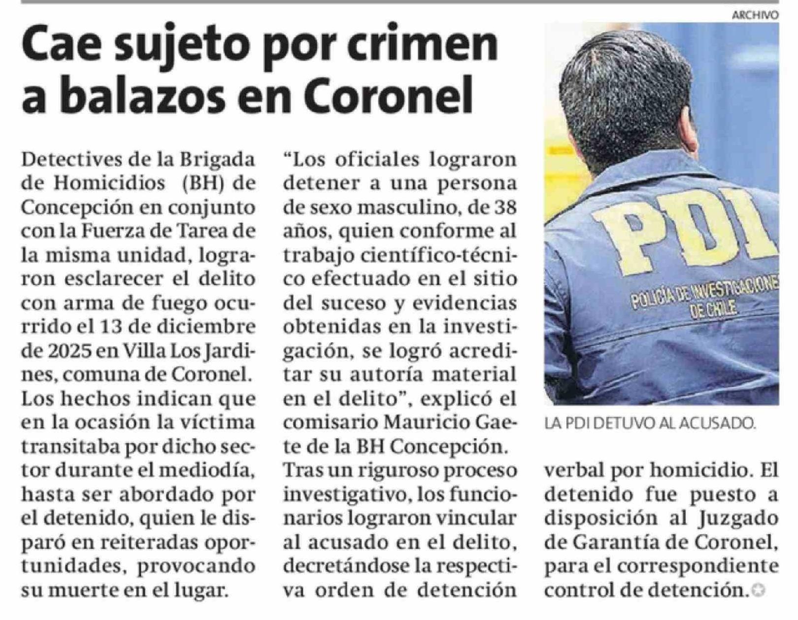 Cae sujeto por crimen a balazos en Coronel 05-02-2026 La Estrella de Concepción |