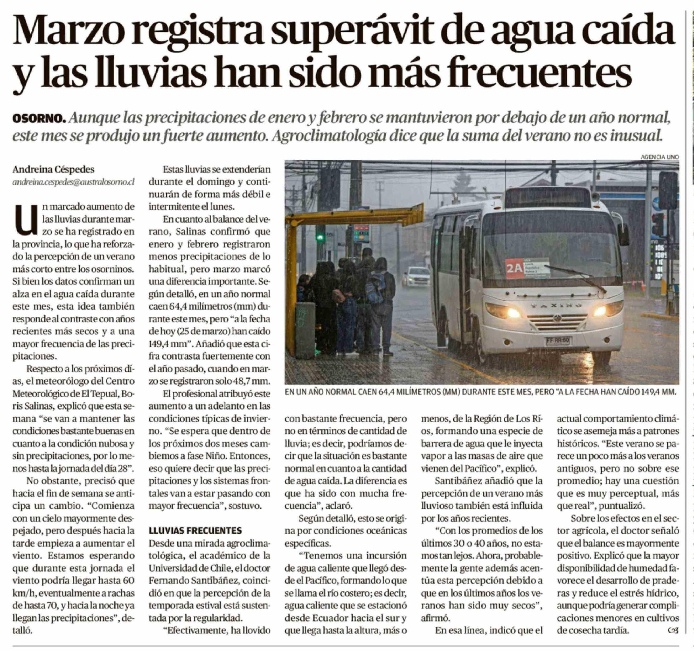Marzo registra superávit de agua caída y las lluvias han sido más frecuentes 26-03-2026 El Austral de Osorno |