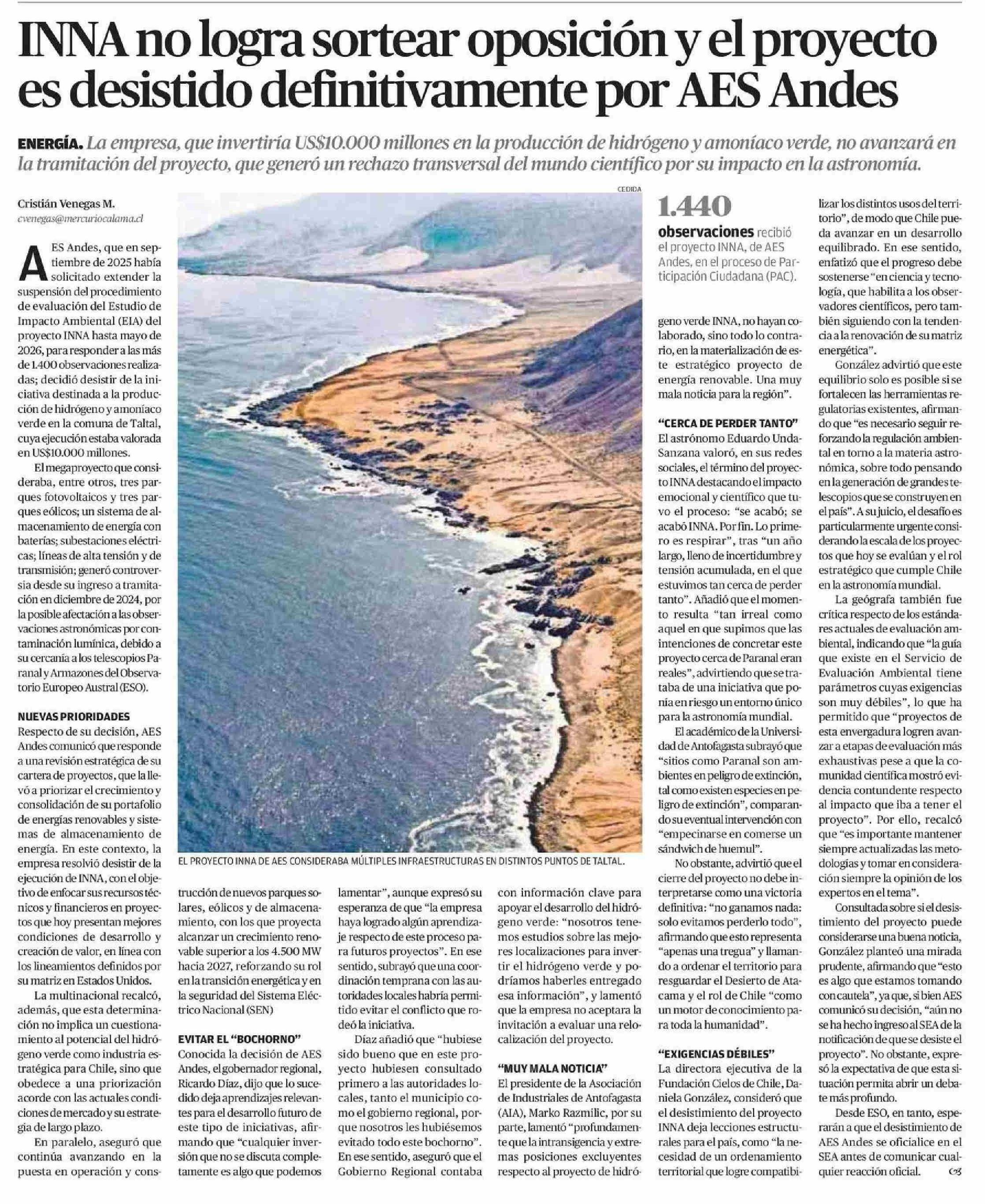 INNA no logra sortear oposición y el proyecto es desistido definitivamente por AES Andes 24-01-2026 El Mercurio de Calama |