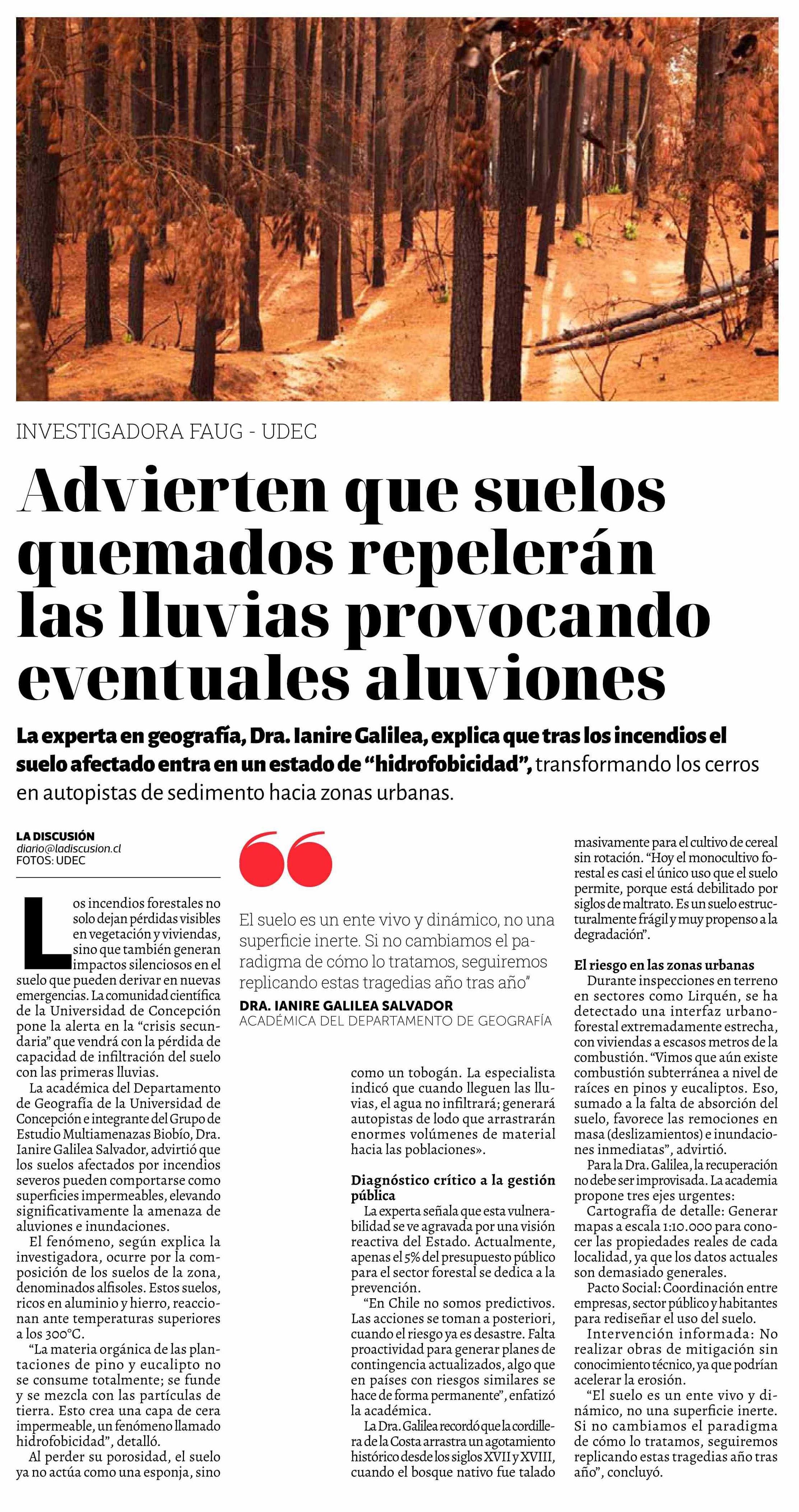 Advierten que suelos quemados repelerán las lluvias provocando eventuales aluviones 25-01-2026 La Discusión |