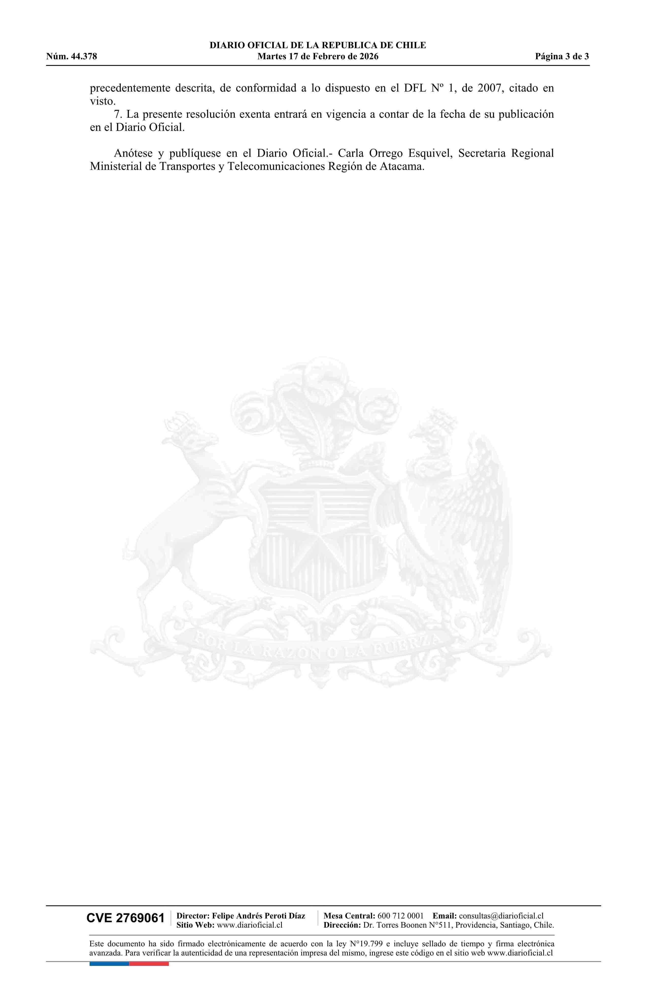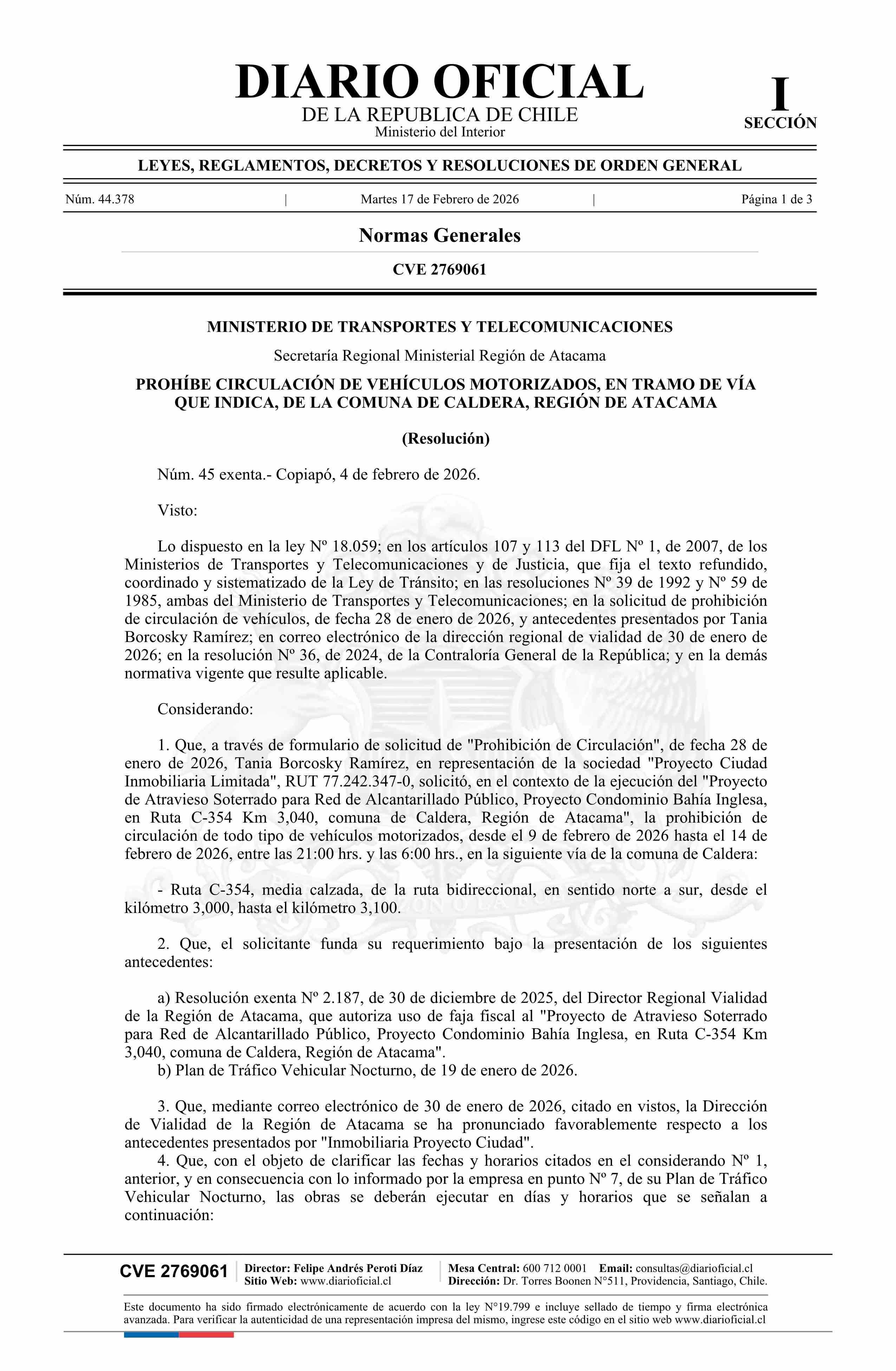 Resolución exenta número 45, de 2026.- Prohíbe circulación de vehículos motorizados, en tramo de vía que indica, de la comuna de Caldera 17-02-2026 Diario Oficial Edición Electrónica |