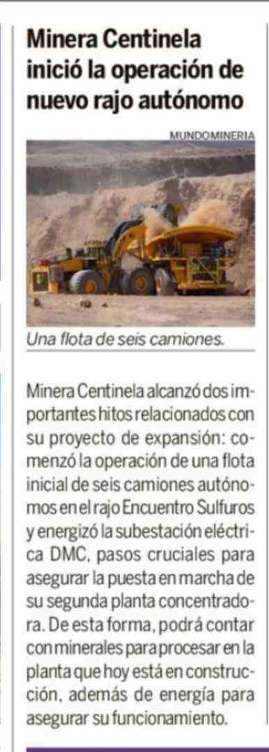 | Título: | Minera Centinela inició la operación de nuevo rajo autónomo |