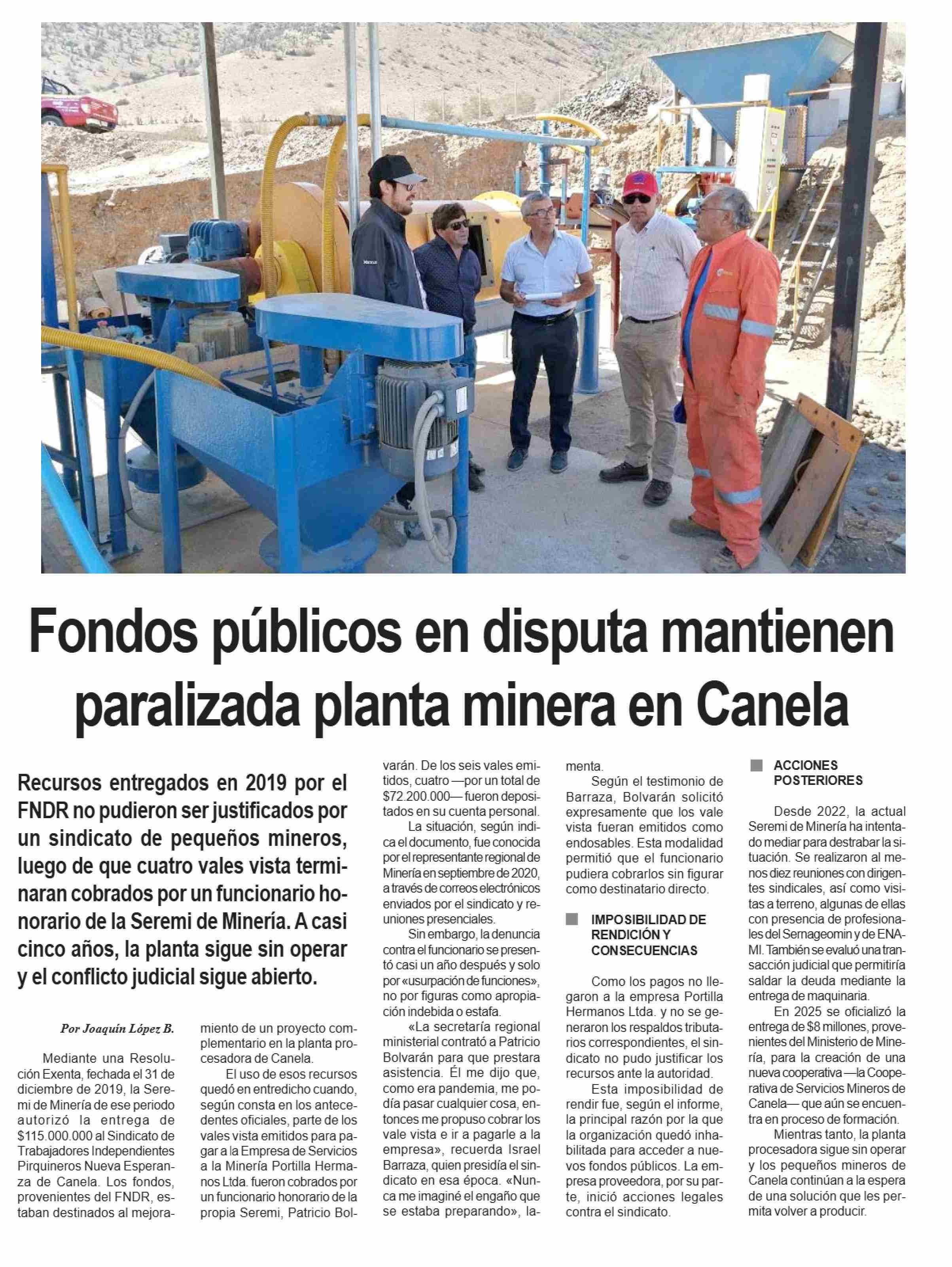 Fondos públicos en disputa mantienen paralizada planta minera en Canela 24-05-2025 Diario la Región |