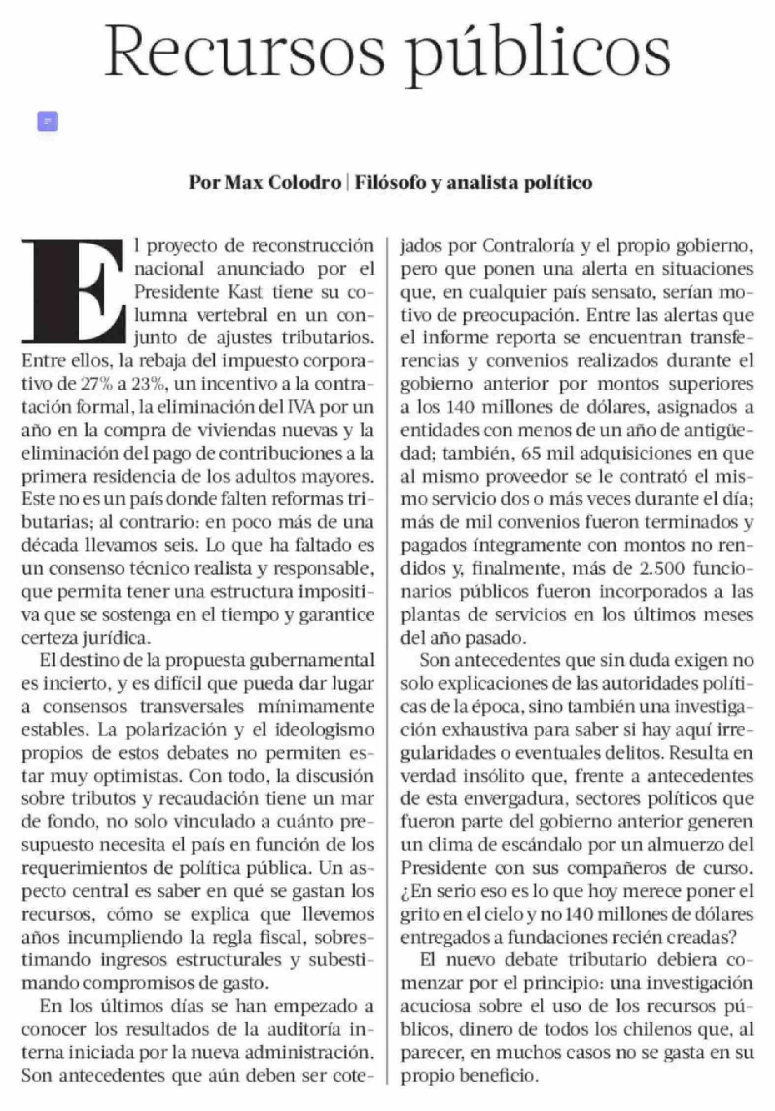 Columnas de Opinión: Recursos públicos 19-04-2026 La Tercera |