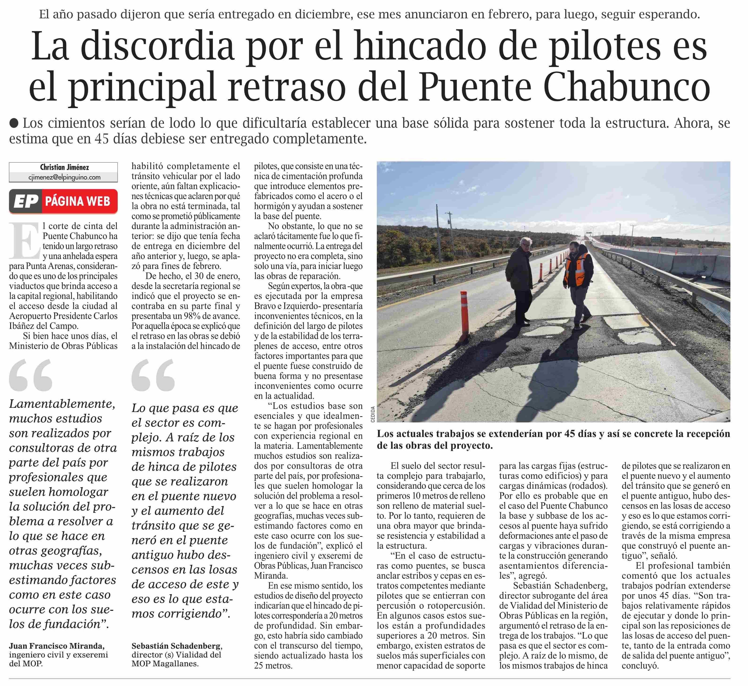 Título: La discordia por el hincado de pilotes es el principal retraso del Puente Chabunco