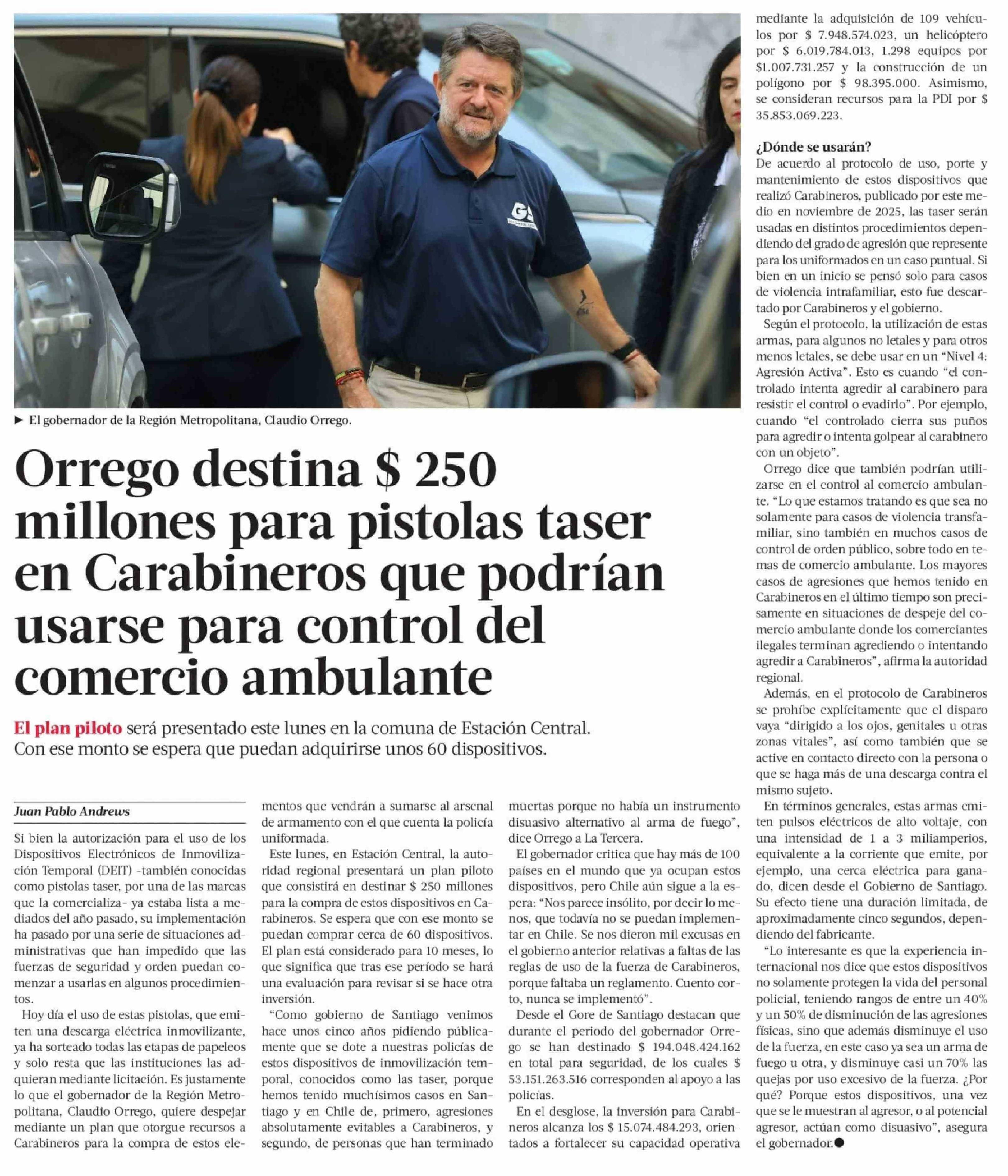 Orrego destina $ 250 millones para pistolas taser en Carabineros que podrían usarse para control del comercio ambulante 13-04-2026 La Tercera |