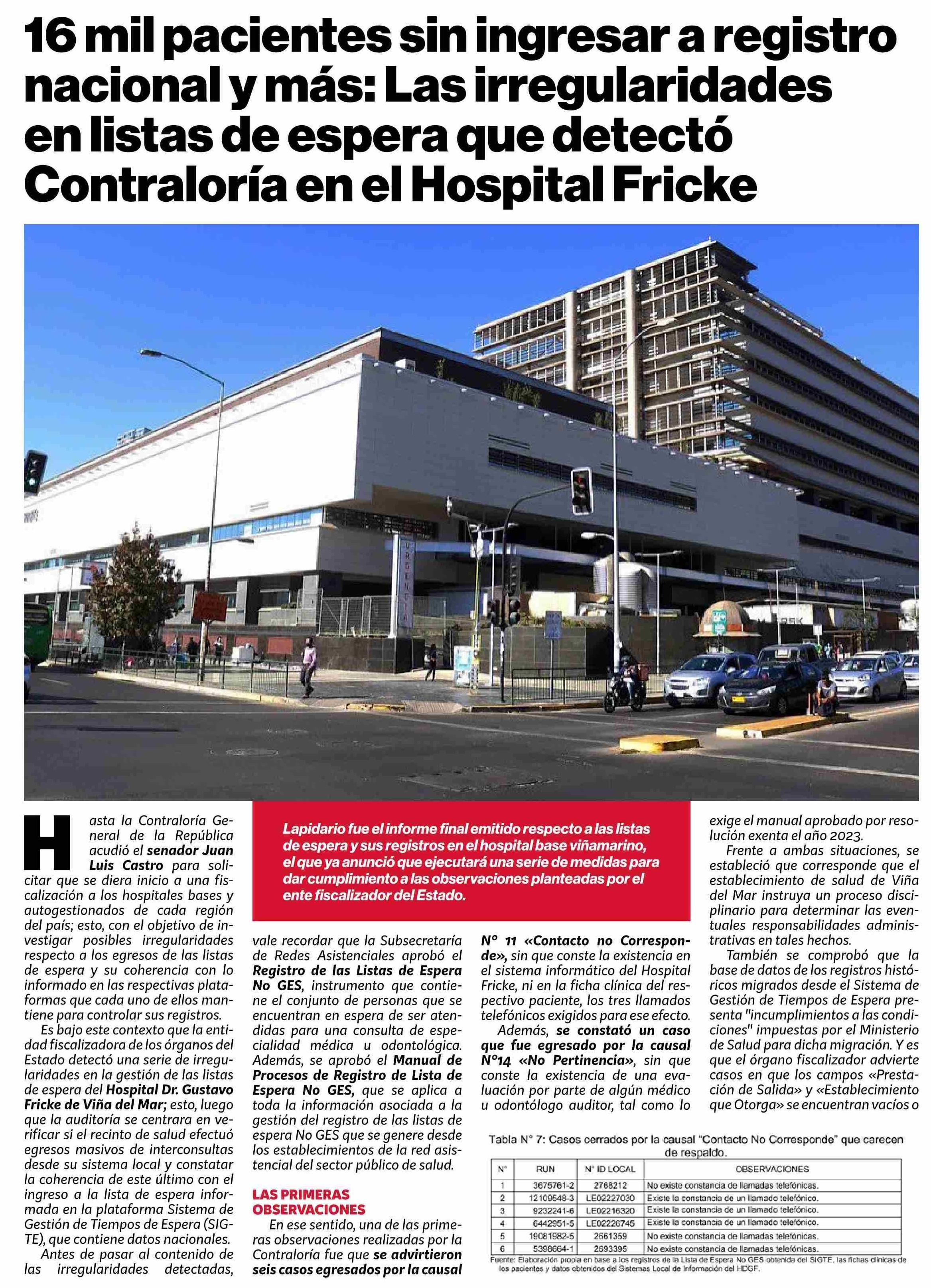 16 mil pacientes sin ingresar a registro nacional y más: Las irregularidades en listas de espera que detectó Contraloría en el Hospital Fricke 04-09-2024 Puranoticia.cl |