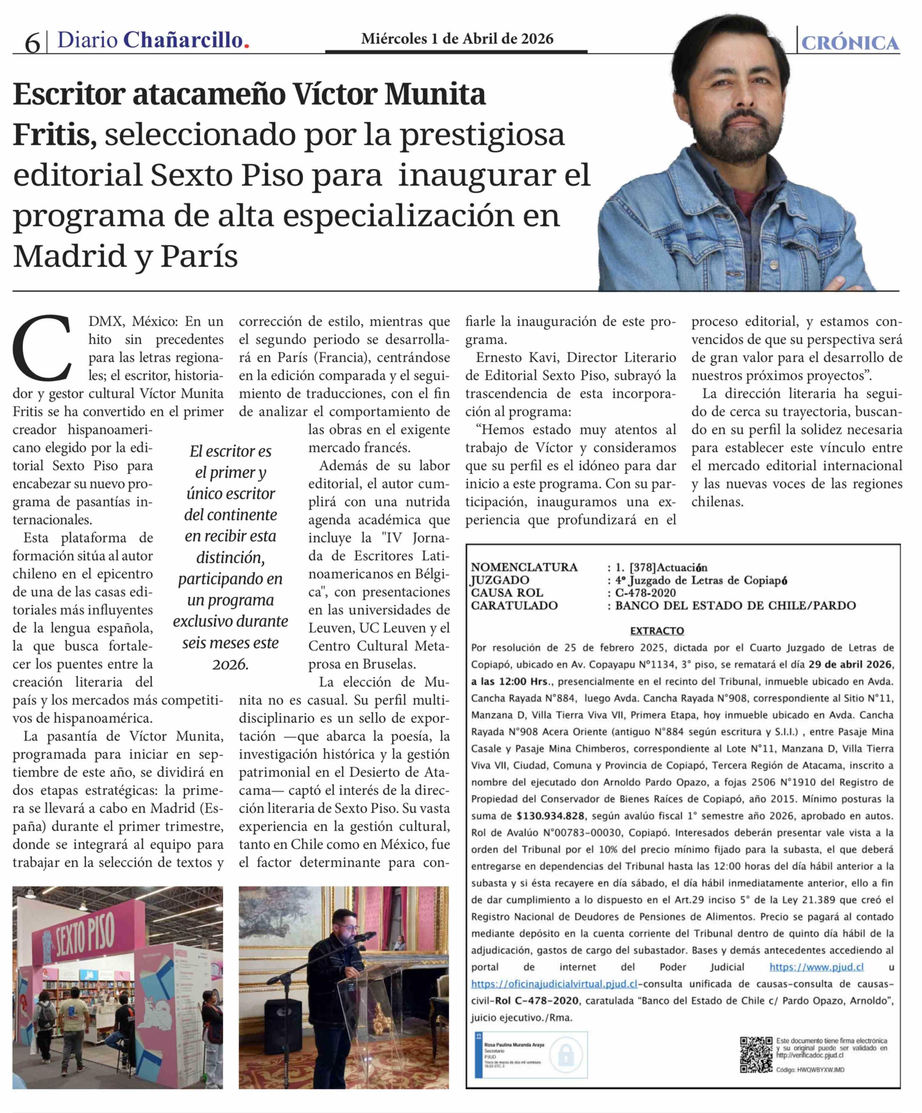 Título: Escritor atacameño Víctor Munita Fritis, seleccionado por la prestigiosa editorial Sexto Piso para inaugurar el programa de alta especialización en Madrid y París
