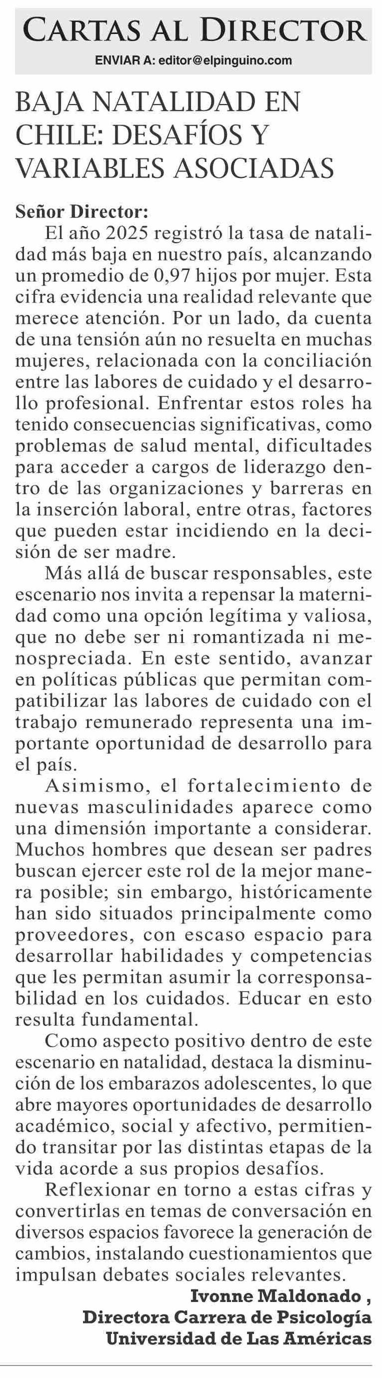 Cartas: Baja natalidad en Chile: desafíos y variaBles asoCiadas