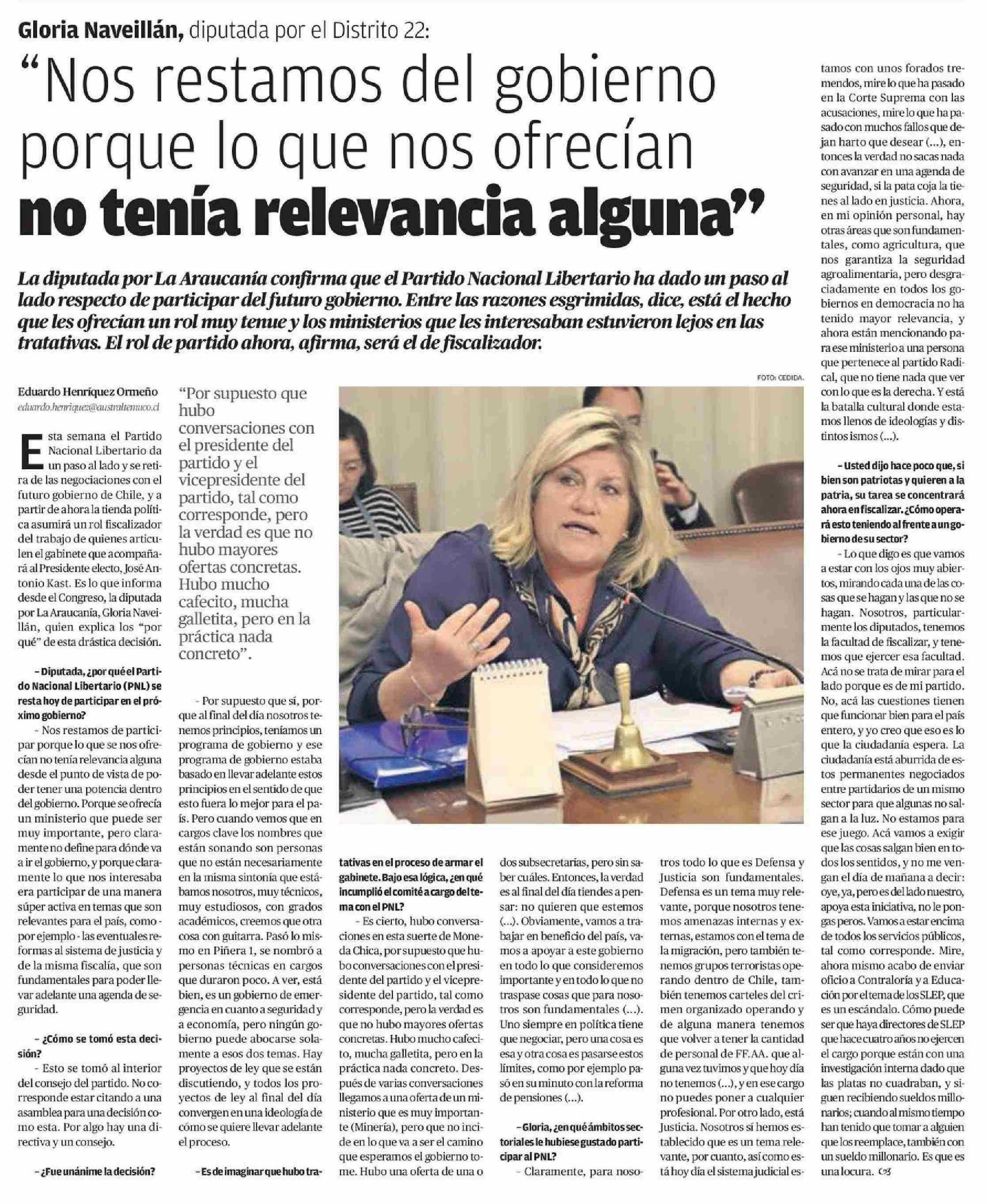 "Nos restamos del gobierno porque lo que nos ofrecían no tenía relevancia alguna" 18-01-2026 El Austral de la Araucanía |