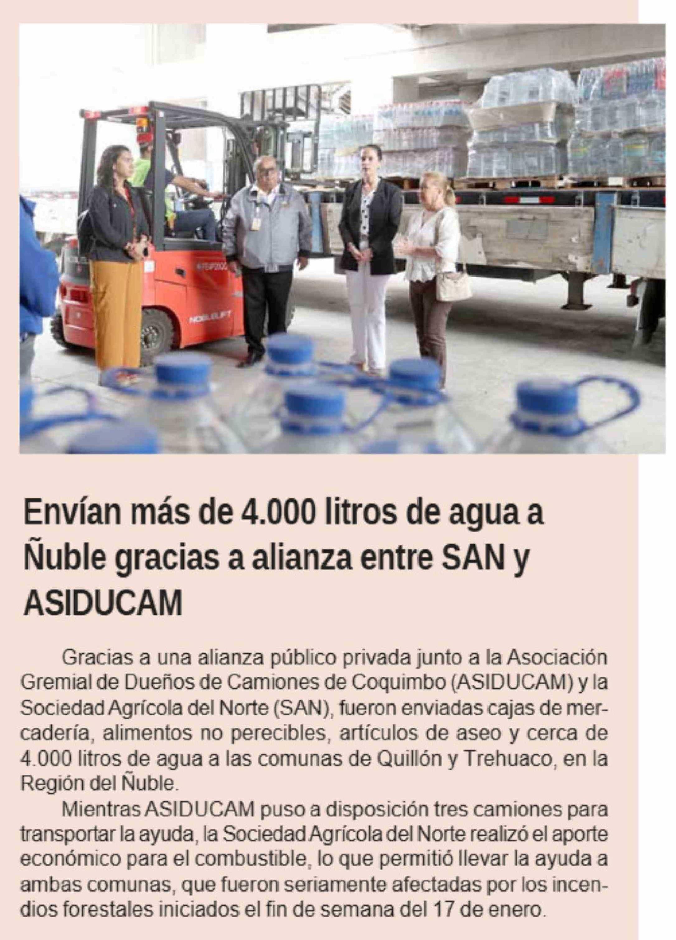 Título: Envían más de 4.000 litros de agua a Ñuble gracias a alianza entre SAN y ASIDUCAM