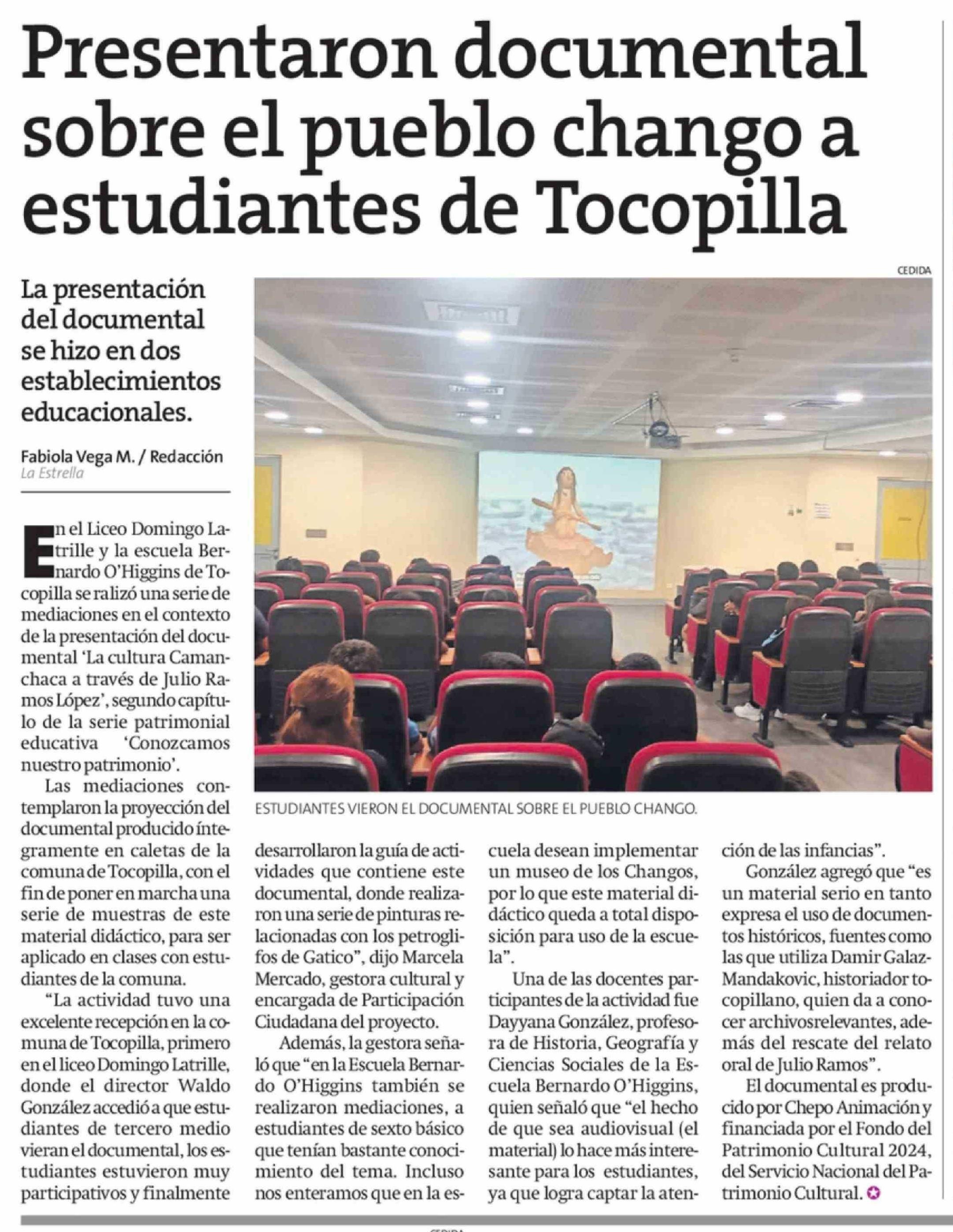 Presentaron documental sobre el pueblo chango a estudiantes de Tocopilla 07-04-2026 La Estrella de Antofagasta |