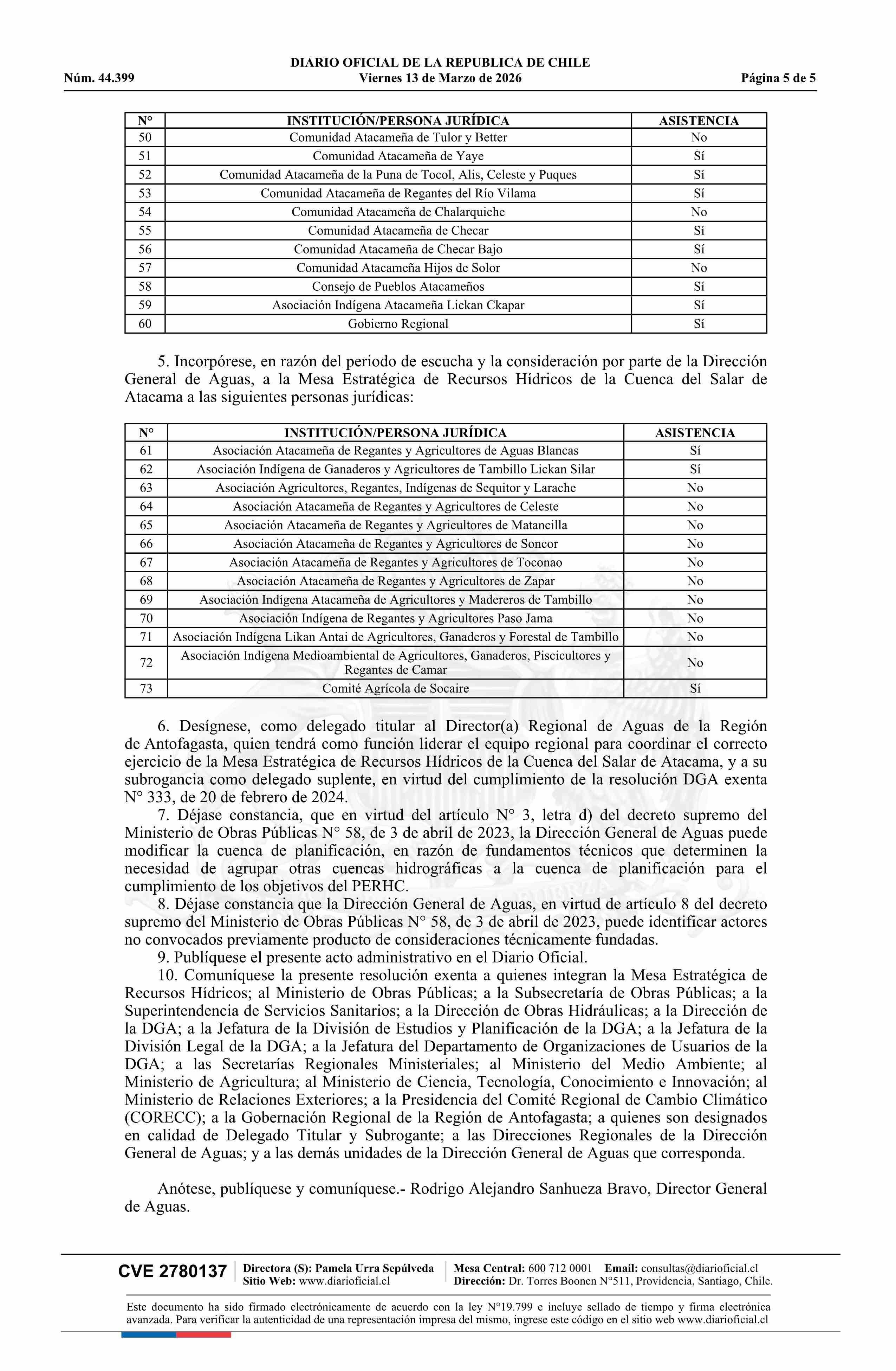 | Título: | Resolución exenta número 492, de 2026.- Delimita y denomina cuenca de planificación para el desarrollo del Plan Estratégico de Recursos Hídricos en la Cuenca del Salar de Atacama; constituye Mesa Estratégica de Recursos Hídricos; identifica convocados y asistencia a primera sesión; y designa Delegad |