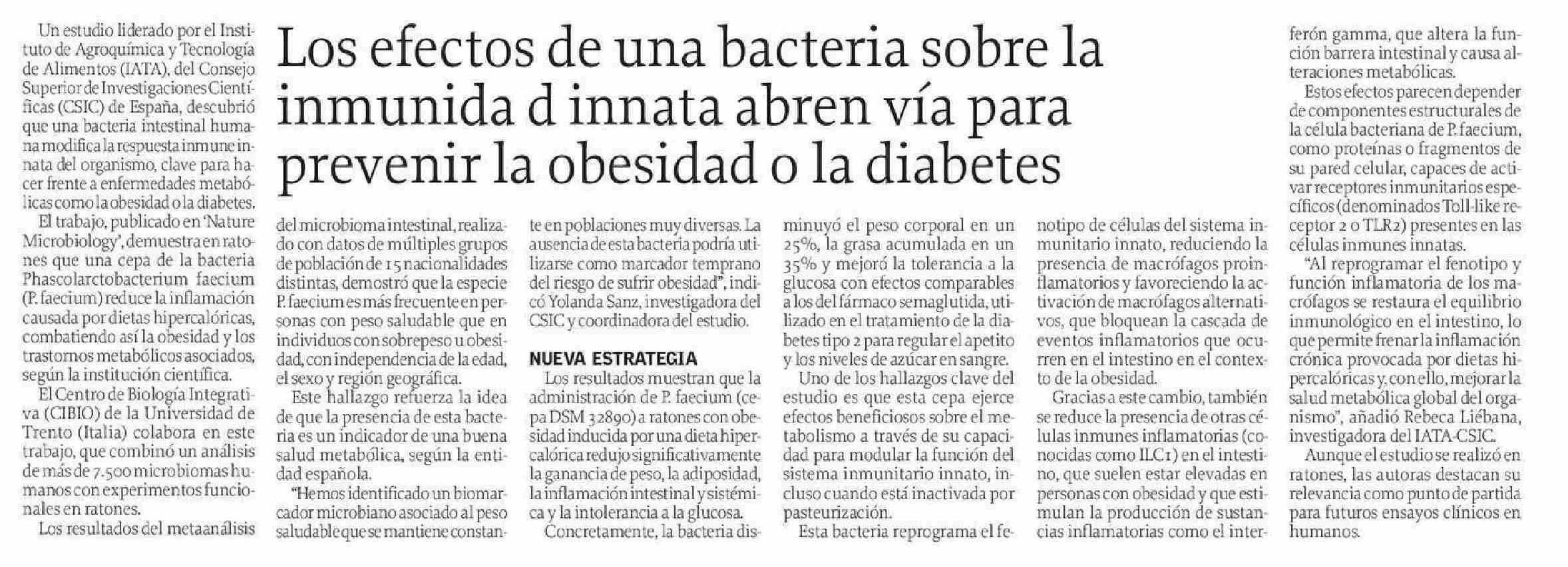 Los efectos de una bacteria sobre la inmunida d innata abren vía para prevenir la obesidad o la diabetes 23-05-2025 El Sur |