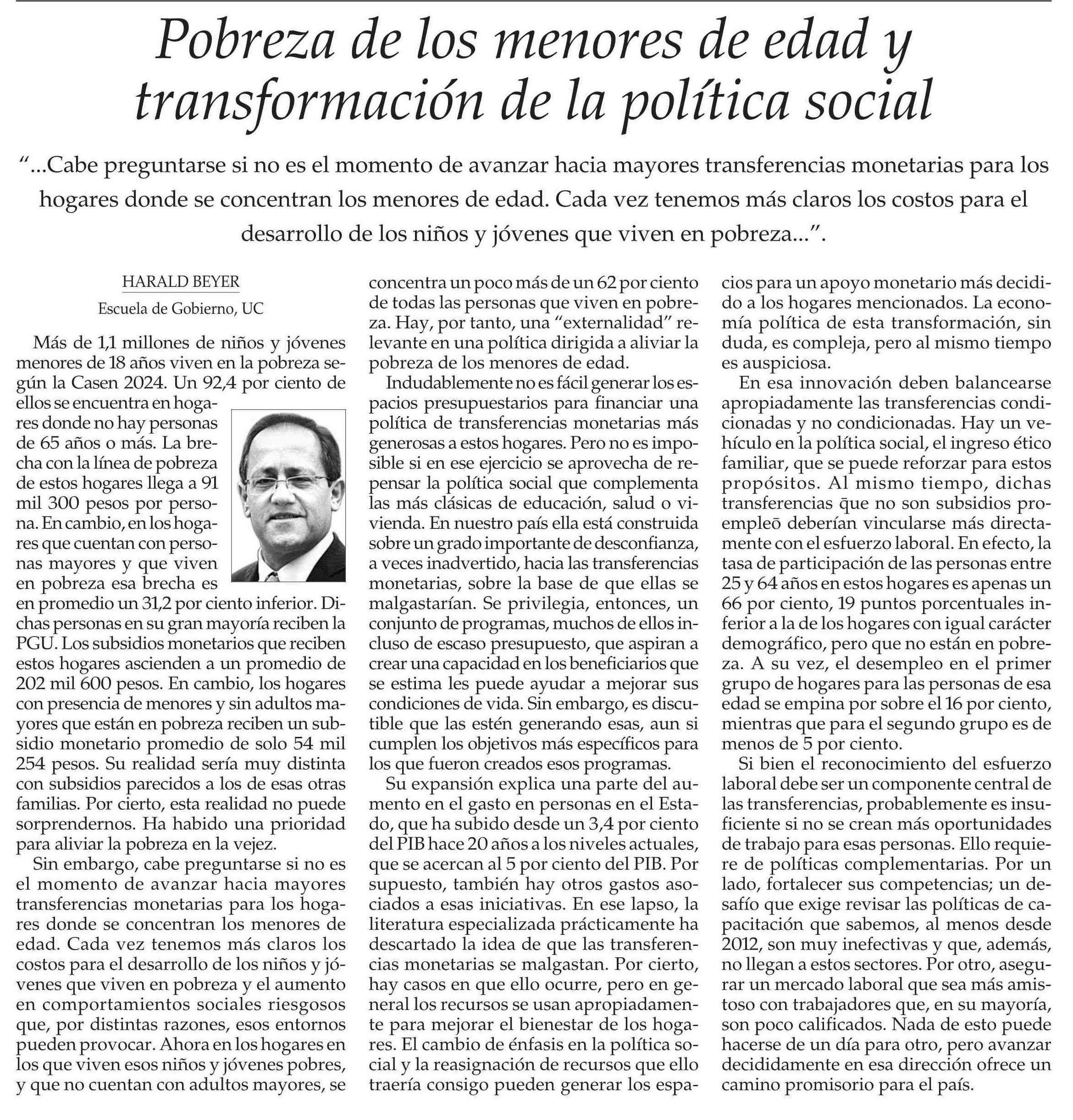 Columnas de Opinión: Pobreza de los menores de edad y transformación de la política social 29-01-2026 El Mercurio |
