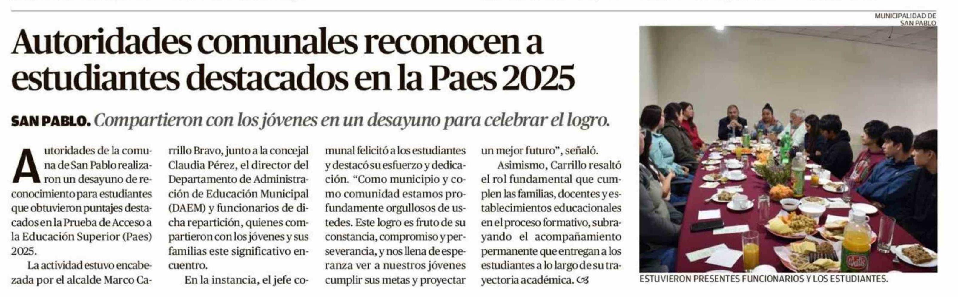 | Título: | Autoridades comunales reconocen a estudiantes destacados en la Paes 2025 |