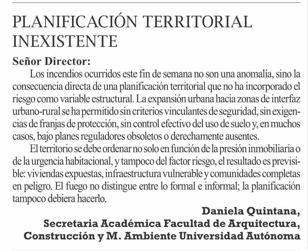 Cartas: PLANIFICACIÓN TERRITORIAL INEXISTENTE 20-01-2026 El Pingüino |
