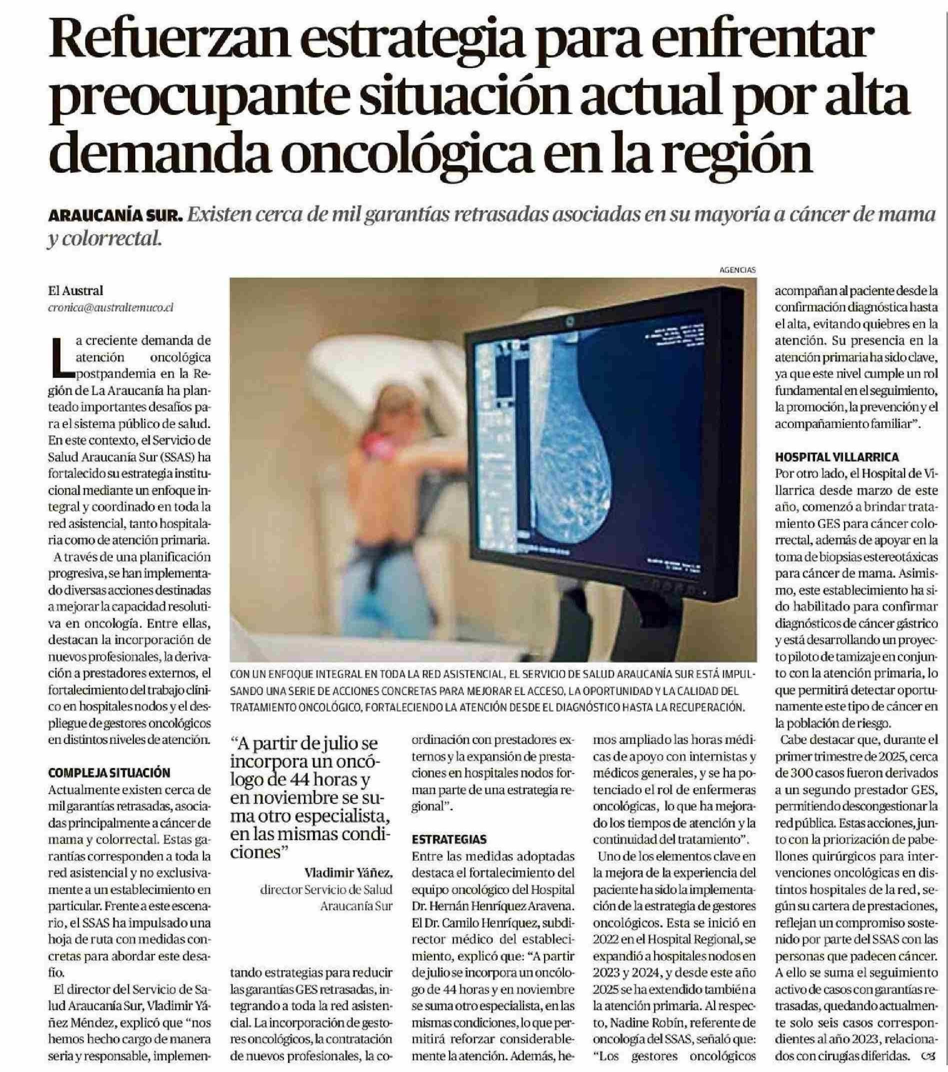 Refuerzan estrategia para enfrentar preocupante situación actual por alta demanda oncológica en la región 01-06-2025 El Austral de la Araucanía |