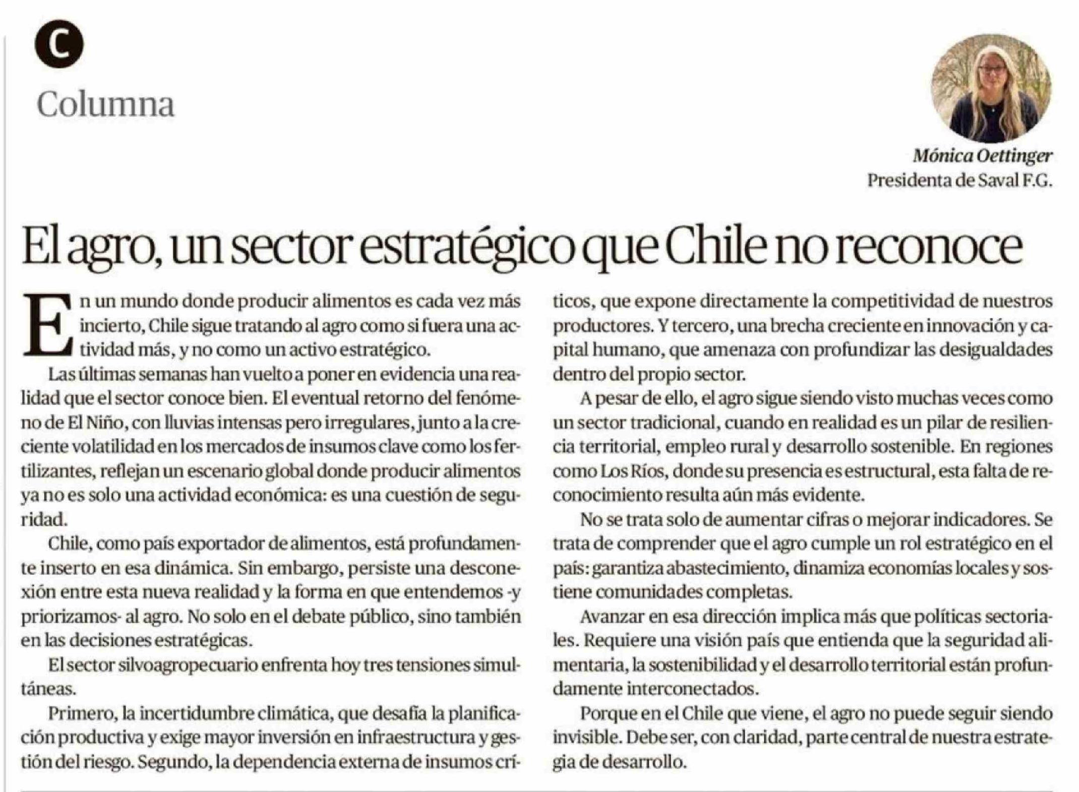 Columnas de Opinión: El agro, un sector estratégico que Chile no reconoce 19-04-2026 Diario Austral Región de Los Ríos |
