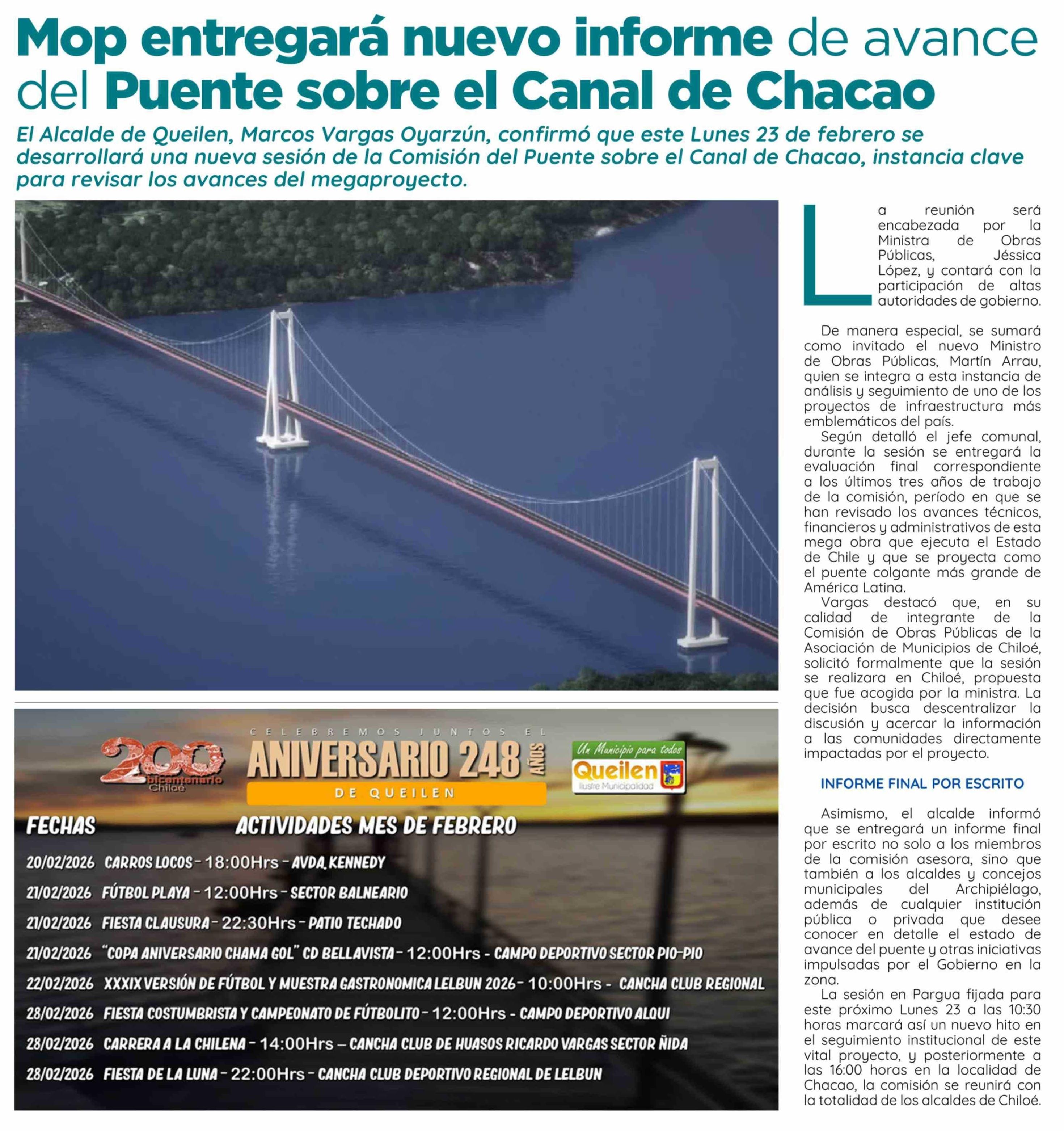 Mop entregará nuevo informe de avance del Puente sobre el Canal de Chacao 20-02-2026 El Insular |