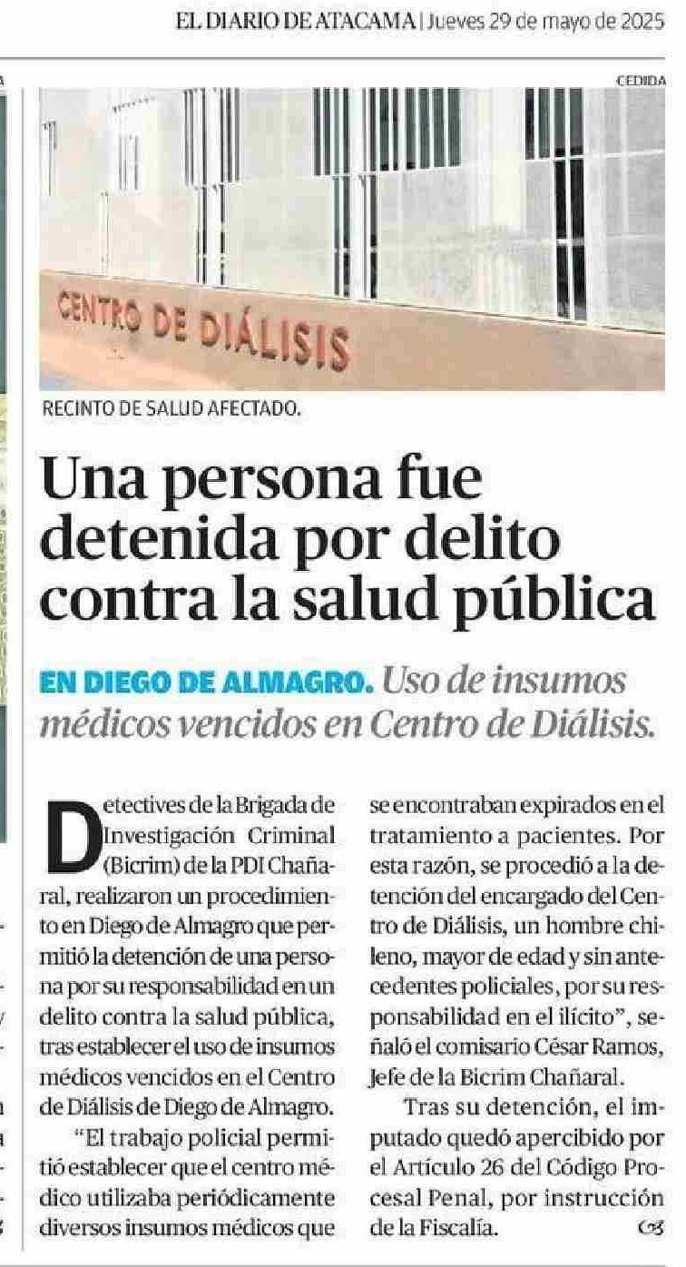 Una persona fue detenida por delito contra la salud pública 29-05-2025 El Diario de Atacama |