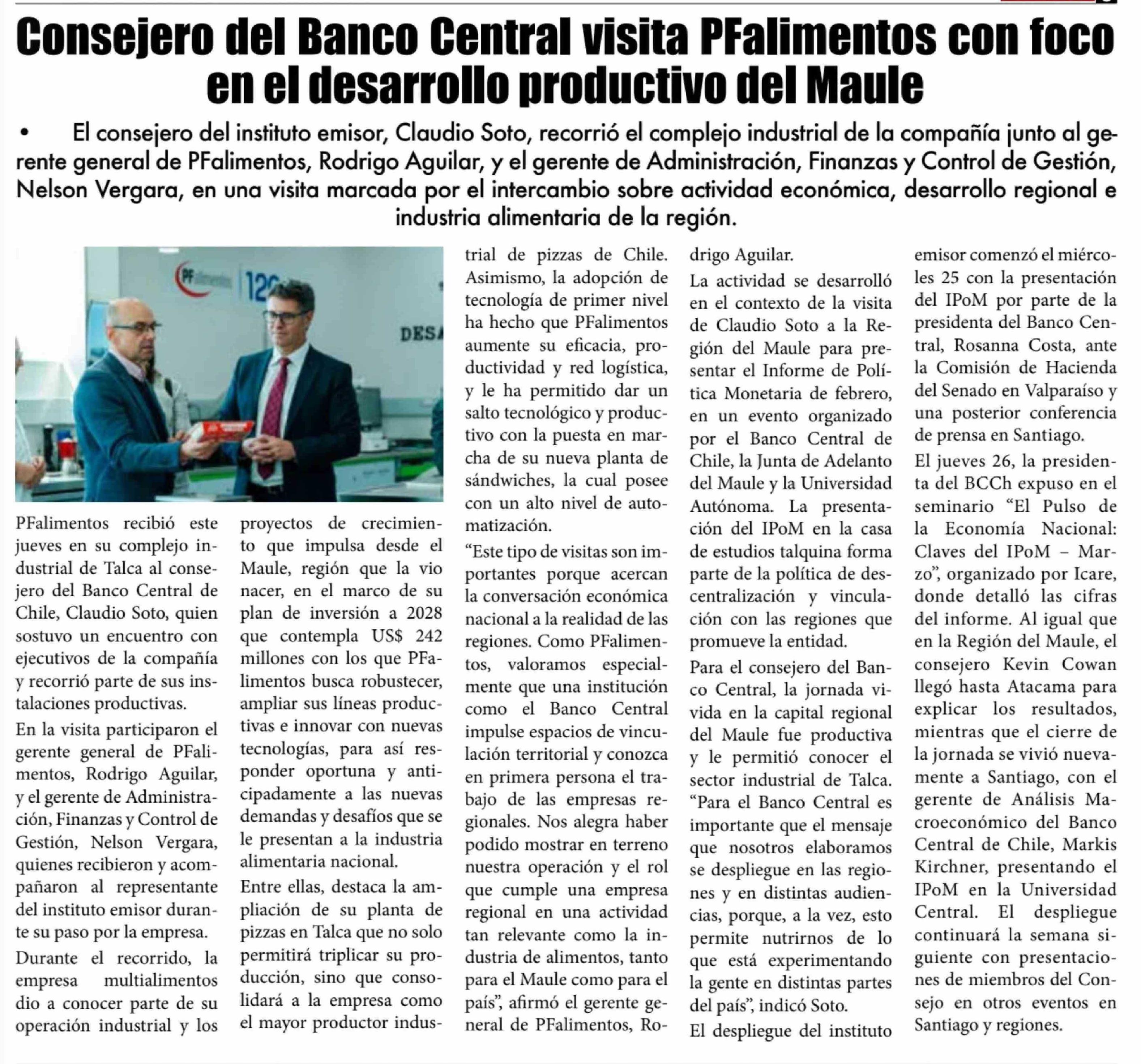 Consejero del Banco Central visita PFalimentos con foco en el desarrollo productivo del Maule 29-03-2026 El Lector |