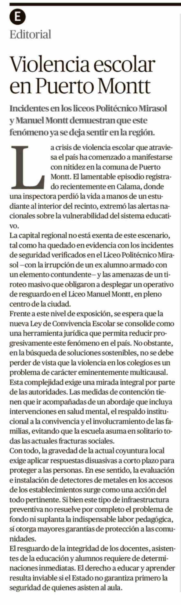 Editorial: Violencia escolar en Puerto Montt 09-04-2026 El Llanquihue |