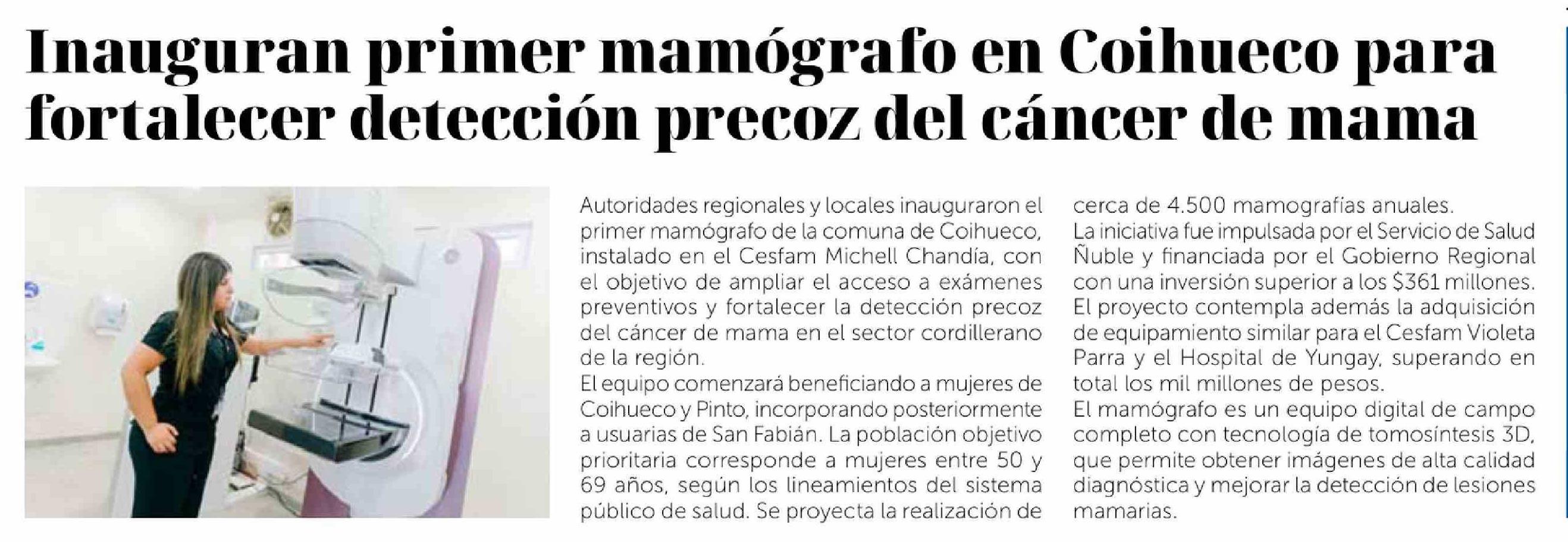 Título: Inauguran primer mamógrafo en Coihueco para fortalecer detección precoz del cáncer de mama